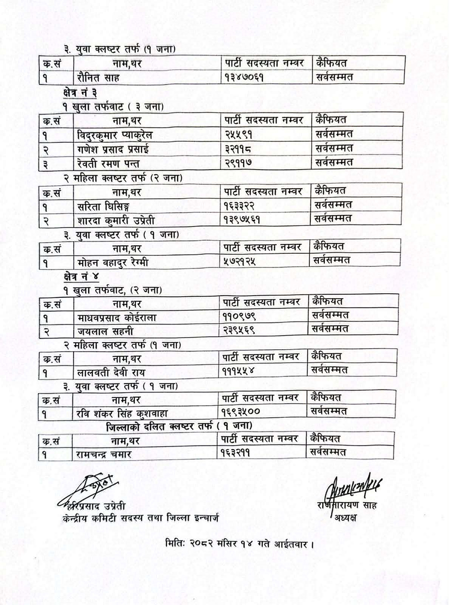 चार वटै निर्वाचन क्षेत्रबाट खुला, महिला, युवा र दलित तर्फका प्रतिनिधि सर्वसम्मत चयन भएका हुन् ।