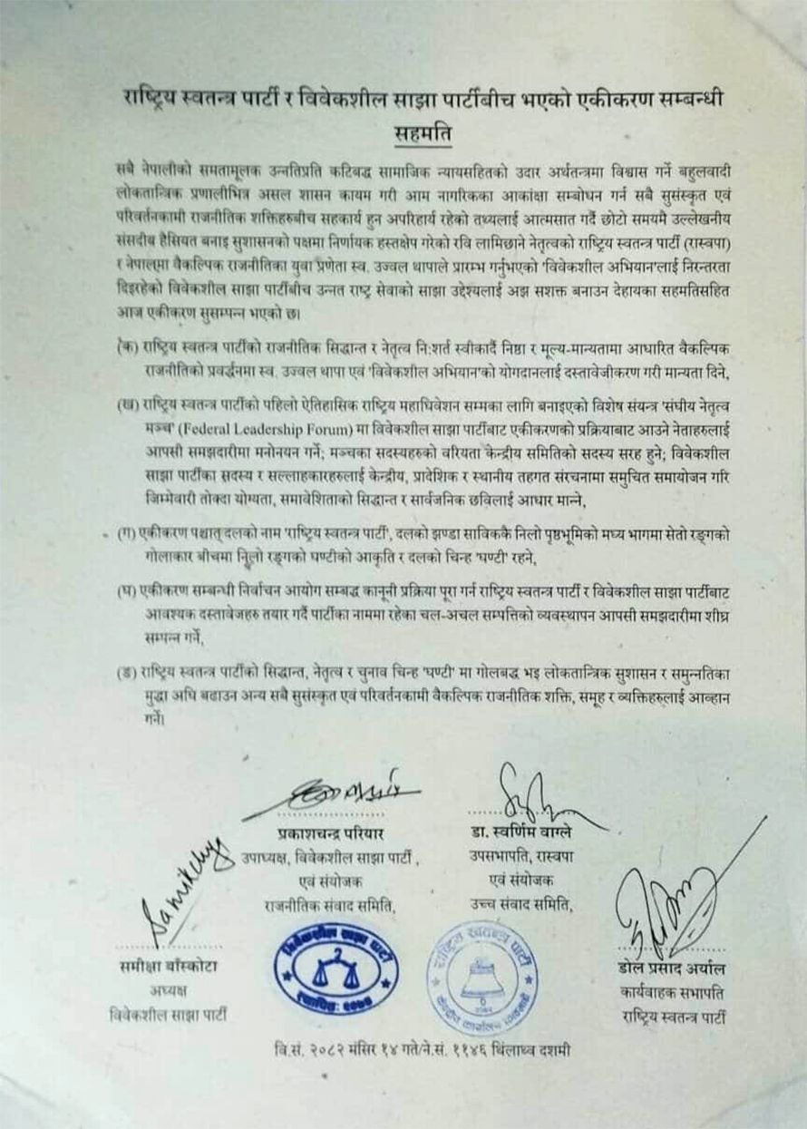 Generated by OK AI. Editorially reviewed.- राष्ट्रिय स्वतन्त्र पार्टी र विवेकशील साझाबीच एकता गरी राष्ट्रिय महाधिवेशनसम्मका लागि संघीय नेतृत्व मञ्चमा मनोनयन गर्ने सहमति भएको छ।