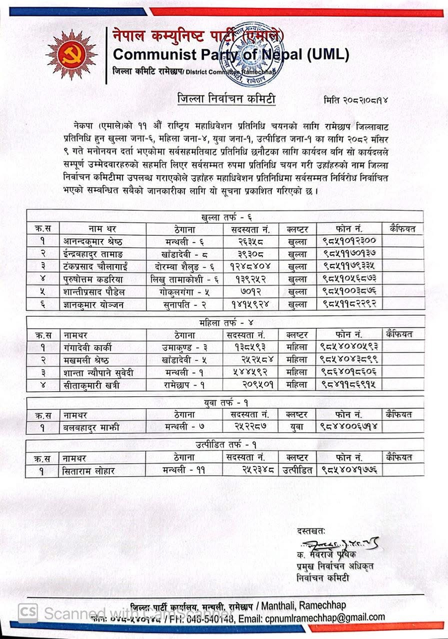 - रामेछापमा पूर्व जिल्ला अध्यक्ष शान्तिप्रसाद पौडेल, पुरुषोत्तम कडरिया र गंगा देवी कार्कीसहित १२ जना प्रतिनिधि छनोट भएका छन्।