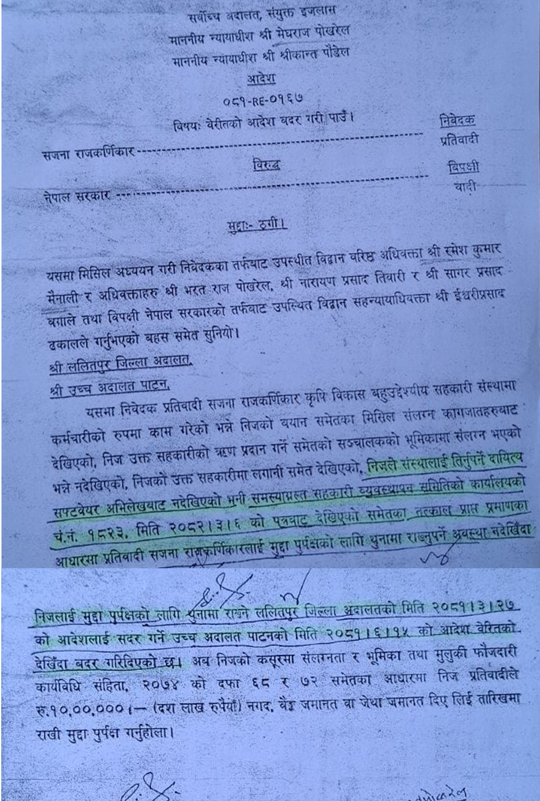 - सर्वोच्च अदालतले समस्याग्रस्त सहकारी अनियमिततामा संलग्न सजना राजकर्णिकारलाई २६ भदौमा थुनामुक्त गर्ने आदेश दिएको हो।