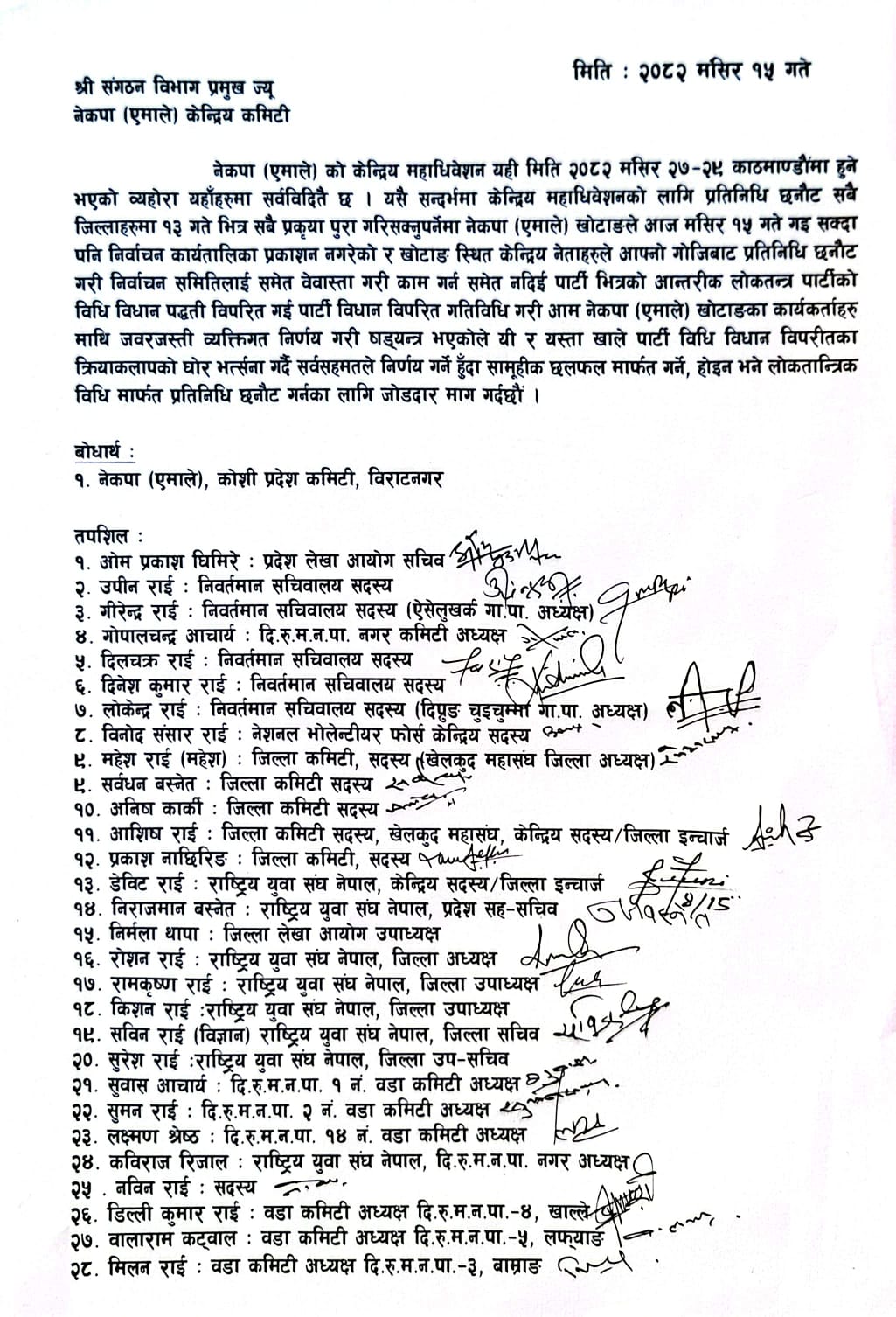जिल्ला अध्यक्ष देवविक्रम राईले सार्वजनिक गरेको सूचीप्रति असहमति जनाउँदै २८ जना युवा नेताले वक्तव्य जारी गरेका छन् । उनीहरूले पार्टीको विधानविपरीत प्रतिनिधि छनोट गरिएकाले सच्याउन माग गरेका छन् ।