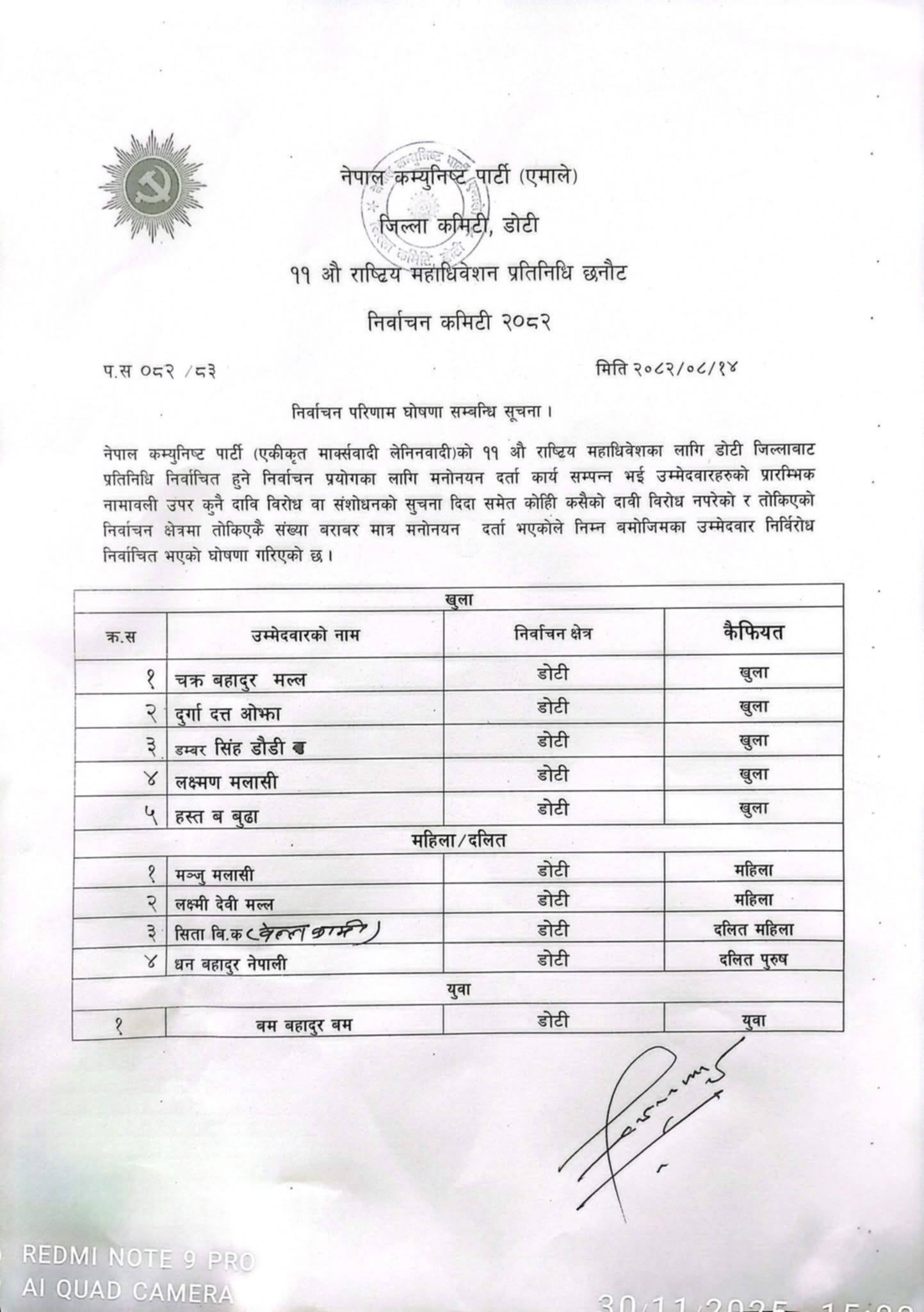 संस्थापन नजिक मानिने जिल्ल सचिव भट्टको सूचीमा खुलातर्फ सच्चिदानन्द जोशी, दीर्घराज बोगटी, शेरबहादुर मल्ल र पदमराज भट्ट, महिला तर्फ रुपा कठायत र लक्ष्मी मल्ल, दलित तफरु शान्ती चुनारा, धनबहादुर नेपाली र युवा तर्फ खेमबहादुर घर्तीलाई चयन गरिएको छ । भट्टलाई जिल्ला इन्चार्ज गौरी ओलीले साथ दिएको दाबी गरिएको छ ।