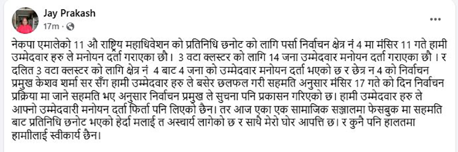उनले लेखेका छन्- ‘नेकपा एमालेको ११औं राष्ट्रिय महाधिवेशनको प्रतिनिधि छनोटका लागि पर्सा निर्वाचन क्षेत्र नं ४ मा ११ मंसिरमा हामी उम्मेदवारहरूले मनोयन दर्ता गराएका थियौं । ३ वटा क्लस्टरका लागि १४ जना उम्मेदवार मनोयन दर्ता गराएका थियौं । र दलित ३ वटा क्लस्टरका लागि ४ जनाको उम्मेदवार मनोयन दर्ता भएको छ । निर्वाचन प्रमुख केशव शर्मा सरसँग हामी उम्मेदवारहरूले बसेर छलफल गरी सहमति अनुसार १७ मंसिरमा निर्वाचन प्रक्रियामा जाने सहमति भए अनुसार निर्वाचन प्रमुखले सूचना पनि प्रकाशन गरिसक्नु भएको छ । हामी उम्मेदवारहरूले आफ्नो उम्मेदवारी मनोयन दर्ता फिर्ता पनि लिएका छैनौं । तर आज एकाएक सामाजिक सञ्जाल फेसबुकमा सहमतिबाट प्रतिनिधि छनोट भएको हेर्दा मलाई त अश्चार्य लागेको छ । साथै मेरो घोर आपत्ति छ । कुनै पनि हालतमा हामाीलाई स्वीकार्य छैन ।’