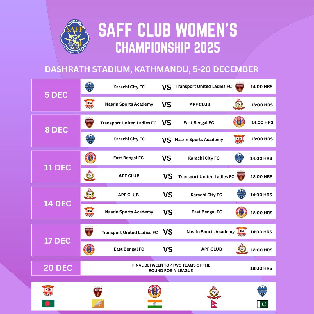 प्रतियोगिताको पहिलो खेल डिसेम्बर ५ मा पाकिस्तानको कराची सिटी एफसी र भुटानको ट्रान्सपोर्ट लेडिज एफसबीच हुनेछ । यस्तै पहिलो दिनै घरेलु टोली एपीएफ क्लबले नसरिन स्पोर्ट्स एकेडेमीसँग प्रतिस्पर्धा गर्नेछ । बंगलादेशी क्लब नसरिनले नेपाली खेलाडीहरू पनि अनुबन्ध गरेको छ ।