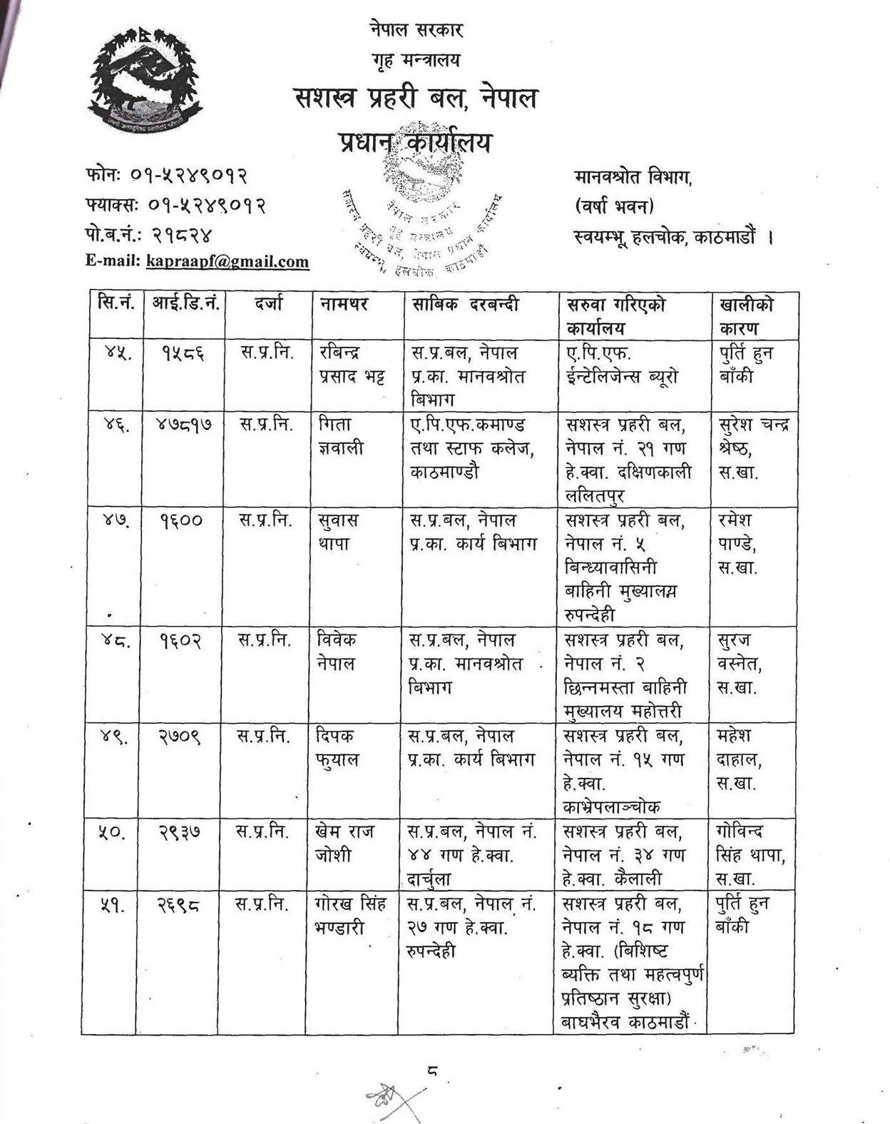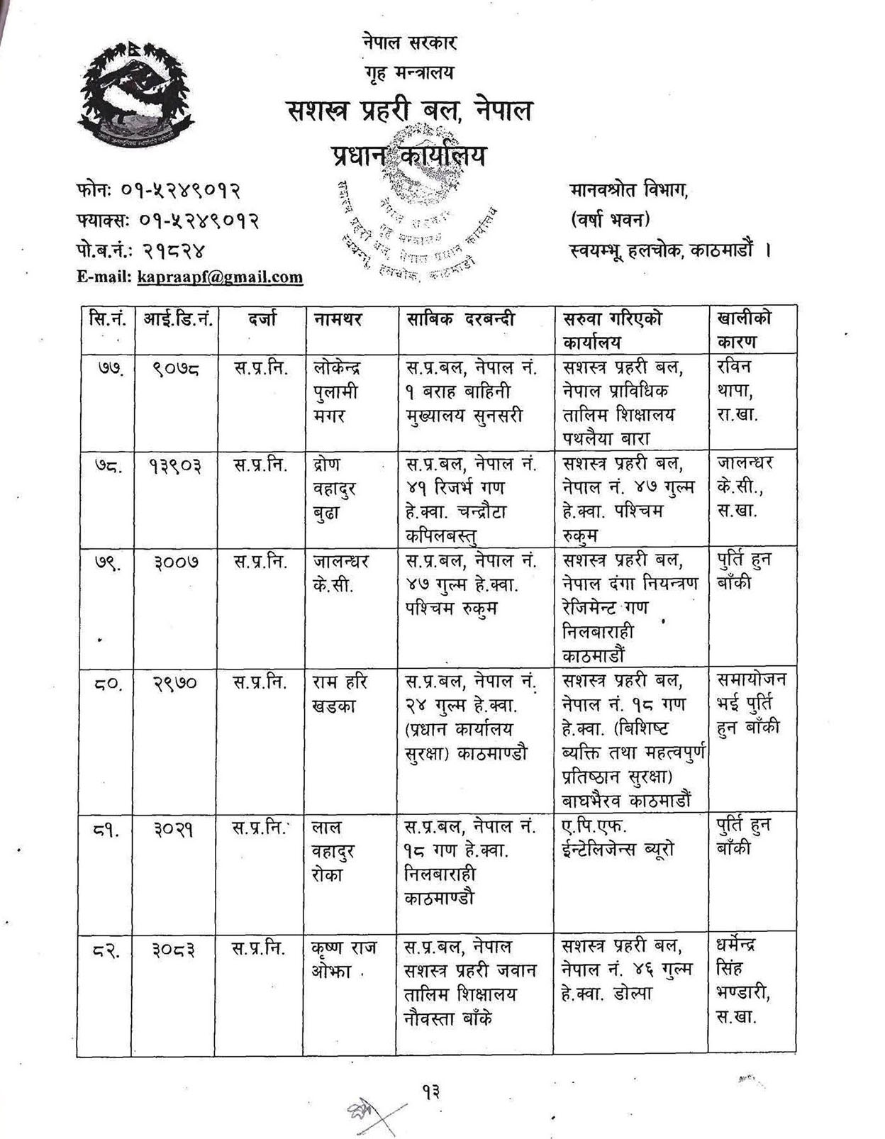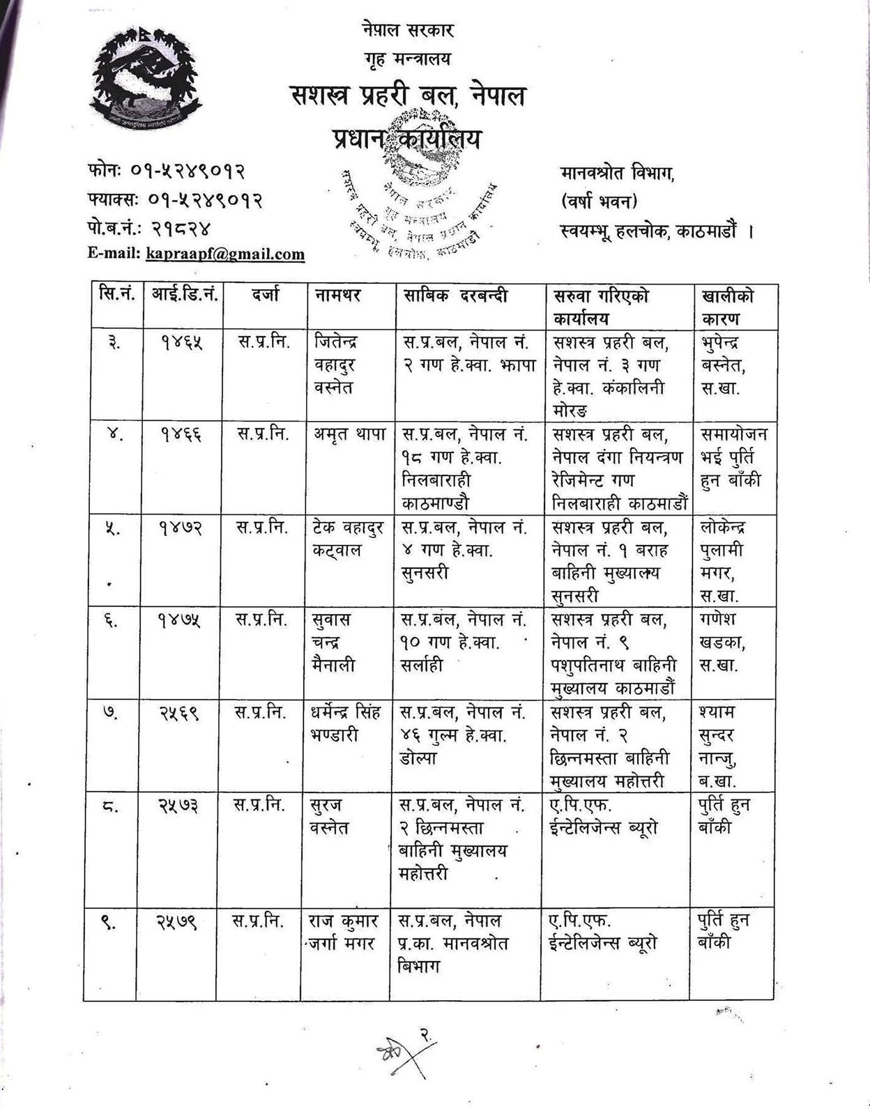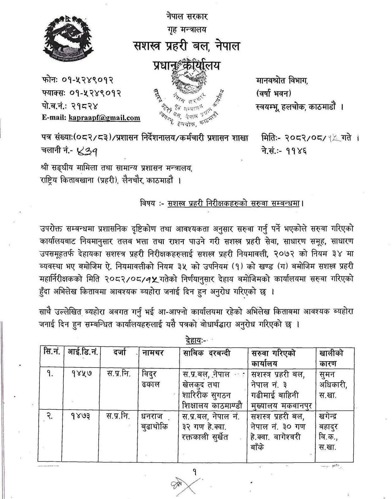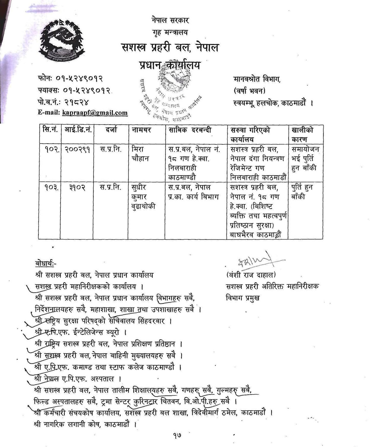 सशस्त्र प्रहरी प्रधान कार्यालय हल्चोकले एक सूचना जारी गर्दै १०३ इन्पेक्टरको सरुवा भएको जानकारी दिएको हो ।
