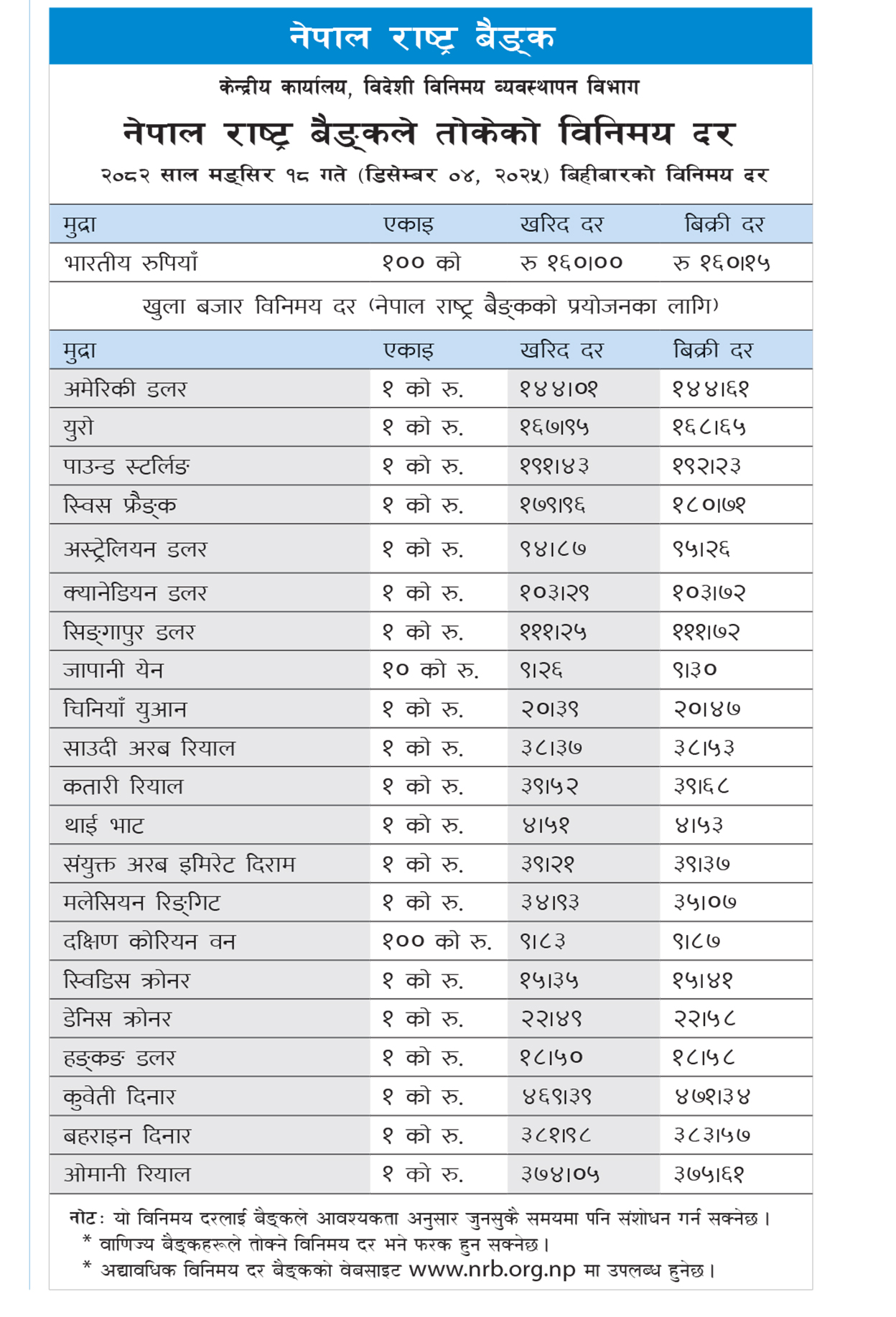 केन्द्रीय बैंकका अनुसार थाई भाट एकको खरिददर चार रुपैयाँ ५१ पैसा र बिक्रीदर चार रुपैयाँ ५३ पैसा, युएई दिराम एकको खरिददर ३९ रुपैयाँ २१ पैसा र बिक्रीदर ३९ रुपैयाँ ३७ पैसा, मलेसियन रिङ्गेट एकको खरिददर ३४ रुपैयाँ ९३ पैसा र बिक्रीदर ३५ रुपैयाँ ०७ पैसा, साउथ कोरियन वन एक सयको खरिददर नौ रुपैयाँ ८३ पैसा र बिक्रीदर नौ रुपैयाँ ८७ पैसा, स्विडिस क्रोनर एकको खरिददर १५ रुपैयाँ ३५ पैसा र बिक्रीदर १५ रुपैयाँ ४१ पैसा र डेनिस क्रोनर एकको खरिददर २२ रुपैयाँ ४९ पैसा र बिक्रीदर २२ रुपैयाँ ५८ पैसा तोकिएको छ ।
