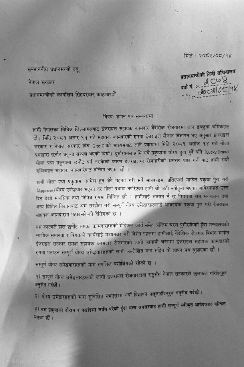 • उनीहरूले श्रम मन्त्रालयदेखि प्रधानमन्त्री कार्यालयसम्म ज्ञापनपत्र बुझाउँदै तत्काल इजरायल पठाउने प्रक्रिया अघि बढाउन आग्रह गरेका छन्।
