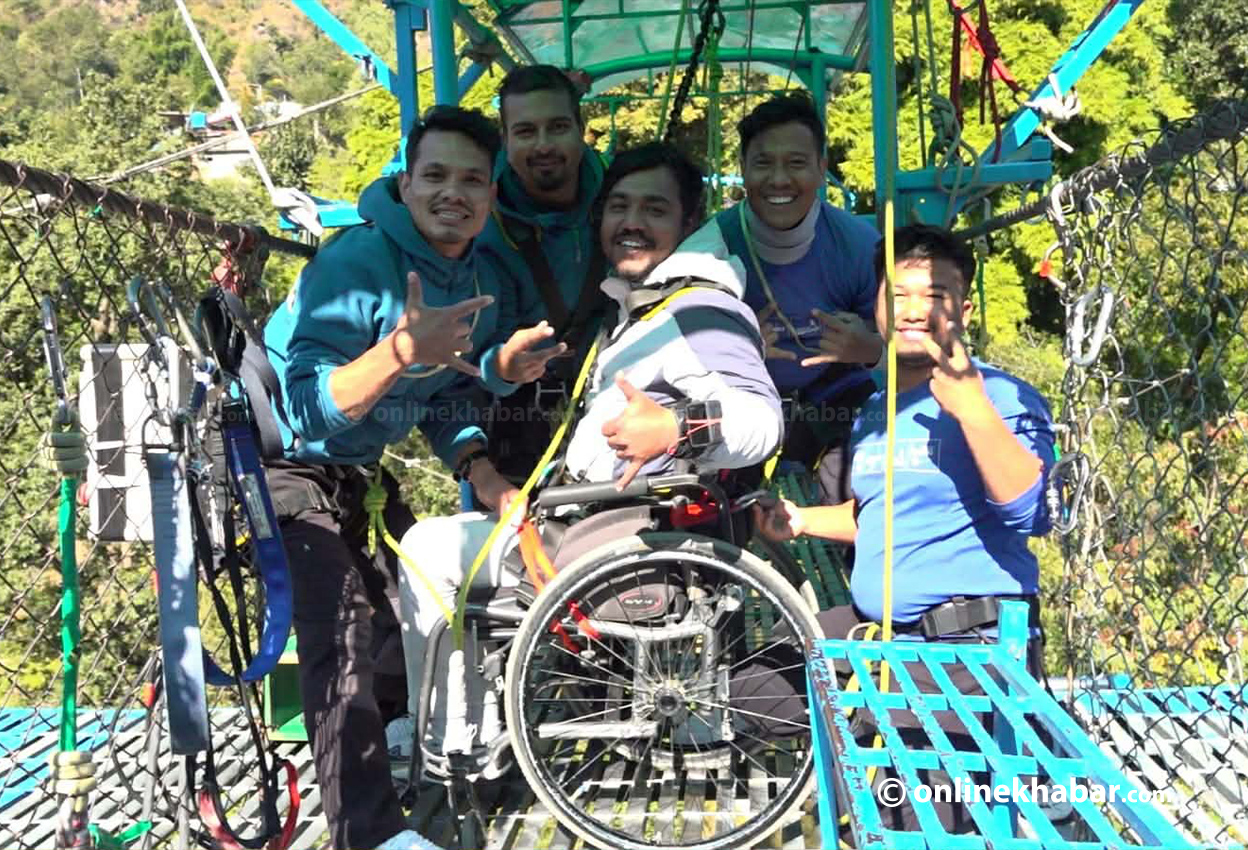१९ मंसिर, काभ्रेपलाञ्चोक । साहस र सामर्थ्यलाई अपाङ्गताले रोक्दैन भने झैं दुई जना अपाङ्गता भएका युवाहरूले ह्वीलचियरमै बसेर बन्जी जम्प गरेका छन् ।