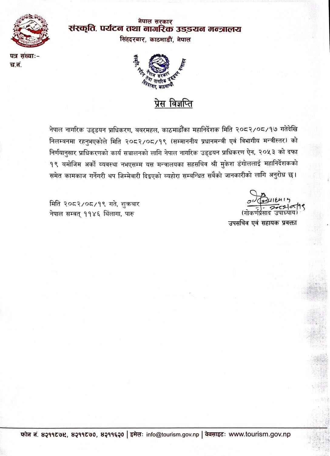 Generated by OK AI. Editorially reviewed.- नेपाल नागरिक उड्डयन प्राधिकरणको महानिर्देशकको जिम्मेवारी सहसचिव मुकेश डंगोललाई दिइएको छ।