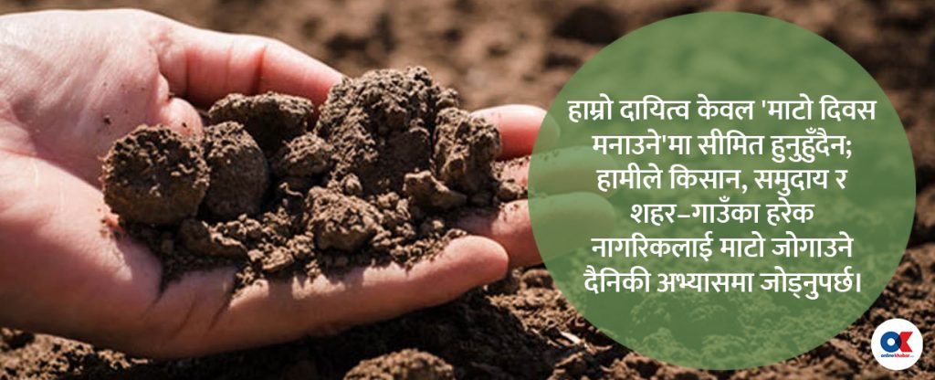 न त गाउँ न शहर, खेतीपातीतिर फर्केर हेर्दा एउटै निष्कर्ष उही निस्कन्छ- स्वस्थ माटोले स्वस्थ खाना उत्पादन गर्छ र स्वस्थ खाना नै स्वस्थ समाजको आधार हो। हामी बिरामी हुँदा डाक्टरले उपचार गर्छन्, तर हामीलाई बिरामी नै कम पार्ने काम किसानले गर्छन् – यदि उनीहरूसँग माटोमैत्री, दिगो खेती अपनाउन चाहिने प्राविधिक र आर्थिक सहयोग उपलब्ध छ भने मात्रै। त्यसैले हाम्रो दायित्व केवल ‘माटो दिवस मनाउने‘मा सीमित हुनुहुँदैन; हामीले किसान, समुदाय र शहर–गाउँका हरेक नागरिकलाई माटो जोगाउने दैनिकी अभ्यासमा जोड्नुपर्छ।
