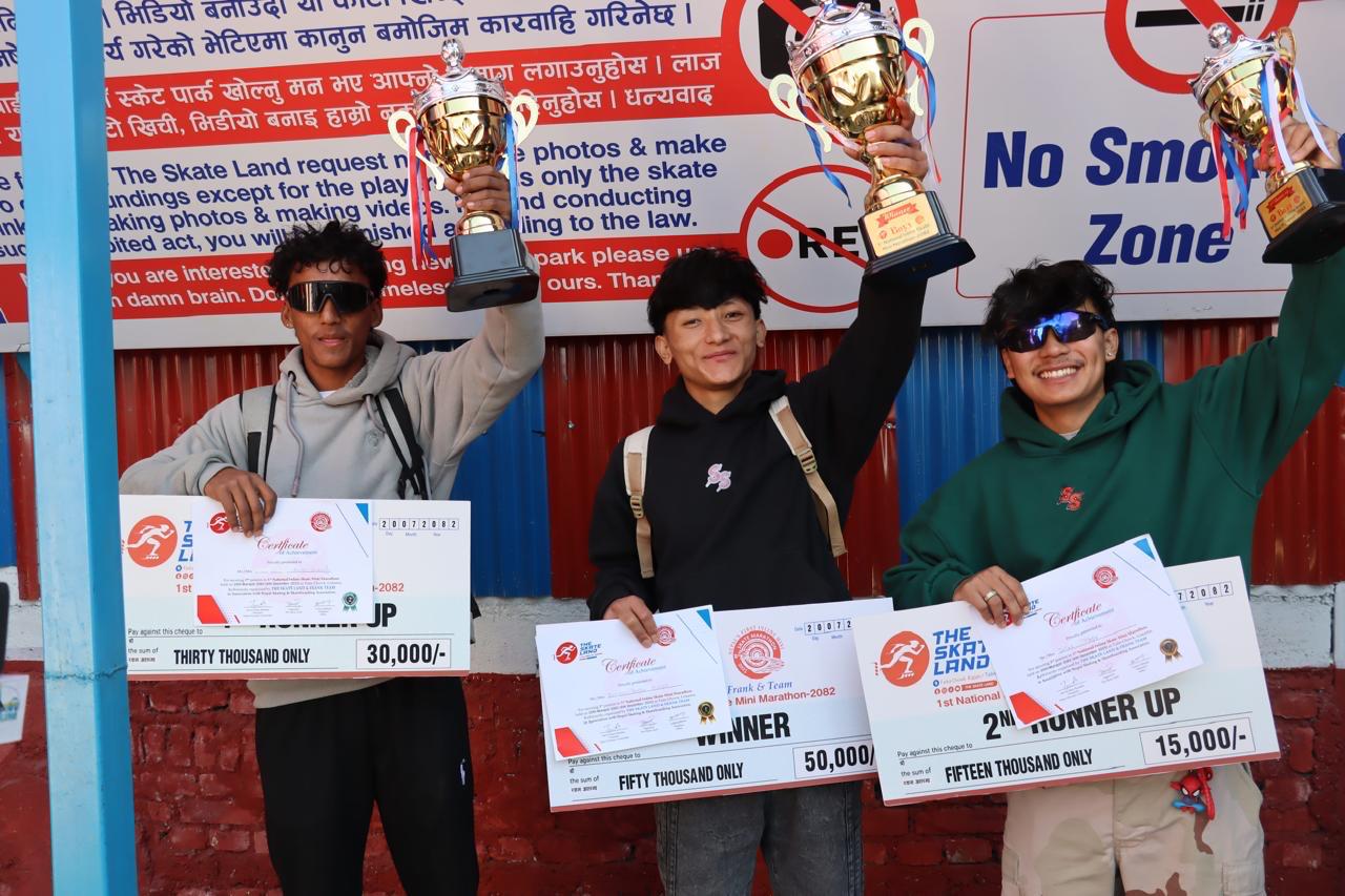 नेपालमै पहिलोपटक राष्ट्रिय स्तरको ओपन स्केट म्याराथन प्रतियोगिता शनिबार बिहान भएको हो । जसमा महिलातर्फ निमिशा पाख्रिन प्रथम, मोनिका मगर दोस्रो र सिवानी रेग्मी तेस्रो भए भने पुरुषतर्फ साम्देन ग्याल्बो शेर्पा प्रथम, अनिश गुरुङ दोस्रो र सफल थापा तेस्रो भएको प्रमुख प्रशिक्षक दिलिपराज बरालले जानकारी दिए ।