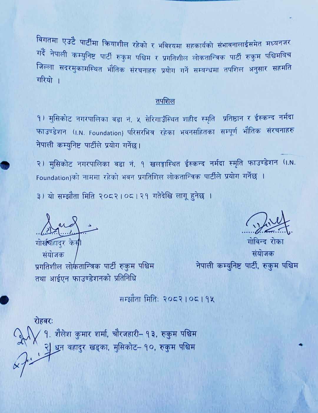यही मंसिर १५ गते नेपाली कम्युनिष्ट पार्टी र प्रगतिशील लोकतान्त्रिक पार्टीका रुकुम पश्चिमका नेताहरुबीच भएको सहमति अनुसार सदरमुकाम मुसिकोट नगरपालिका ५ सेरीगाउँस्थित शहीद स्मृति प्रतिष्ठान र इस्कन्द नर्मदा फाउन्डेसन परिसरभित्र रहेका भवनसहितका सम्पूर्ण भौतिक संरचनाहरु नेपाली कम्युनिष्ट पार्टीले प्रयोग गर्नेछ ।