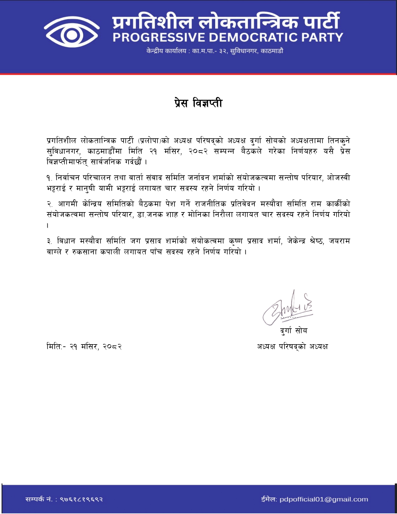 २१ मंसिर, काठमाडौं । प्रगतिशील लोकतान्त्रिक पार्टी (प्रलोपा) ले निर्वाचन परिचालन तथा वार्ता संवाद सहित ३ समिति गठन गरेको छ ।