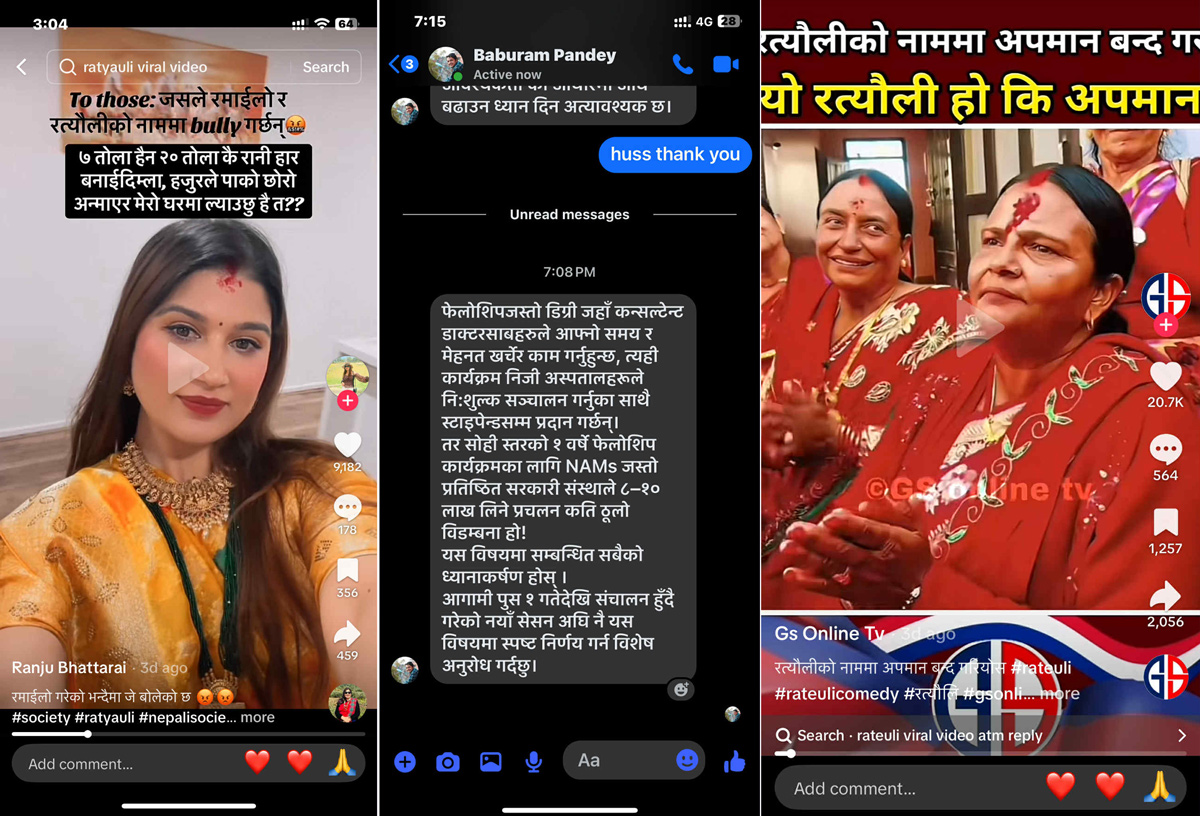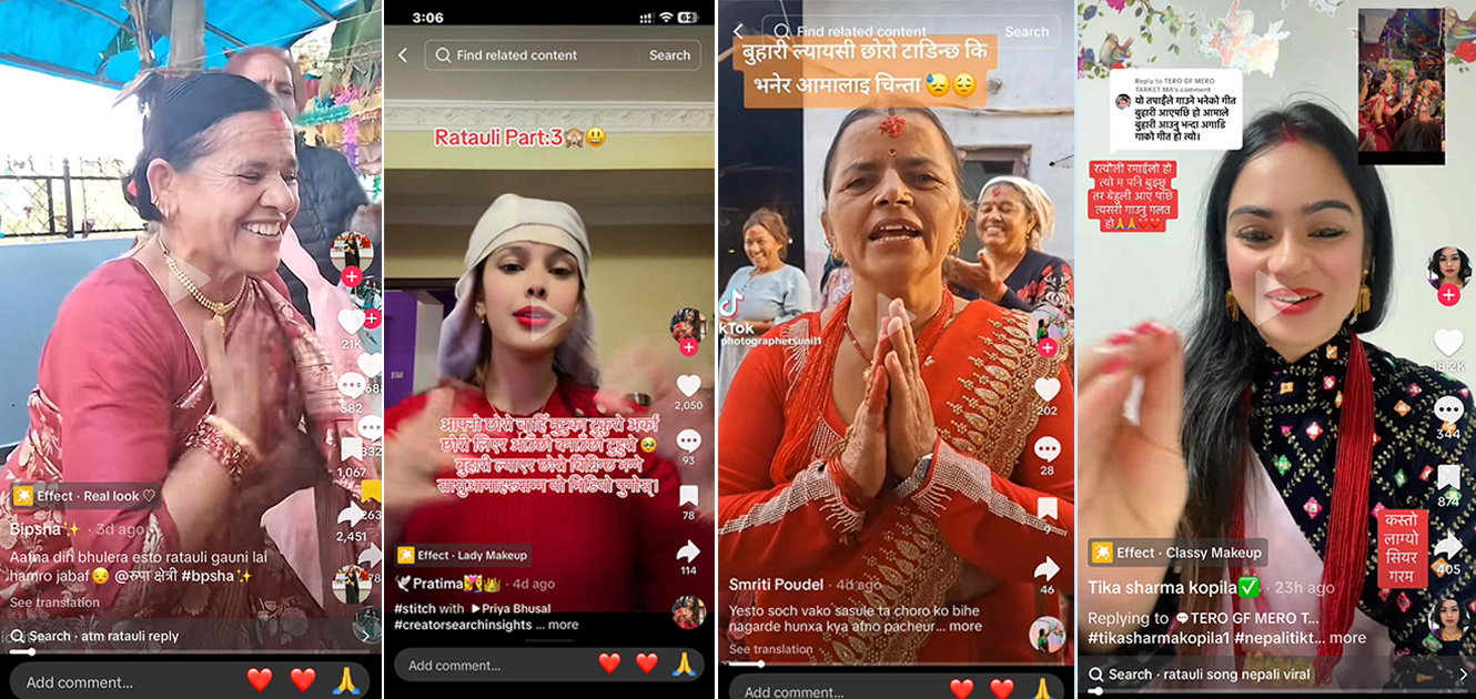 अहिले टिकटकमा सासू–बुहारीबीच रत्यौली ब्याटल चलिरहेको छ, जसमा प्रयोग हुने शब्दहरूले सासू र बुहारी दुवैमा मनोवैज्ञानिक प्रभाव पर्ने मनोविद् गृष्मा पनेरु बताउँछिन् । ‘पहिले रत्यौली खेल्दा रेकर्ड हुँदैनथ्यो र त्यहीं सकिन्थ्यो’ पनेरू भन्छिन्, ‘तर अहिले रेकर्ड भएर बारम्बार सुन्न सकिन्छ, जसले नयाँ बुहारीलाई असहज बनाउँछ । ’