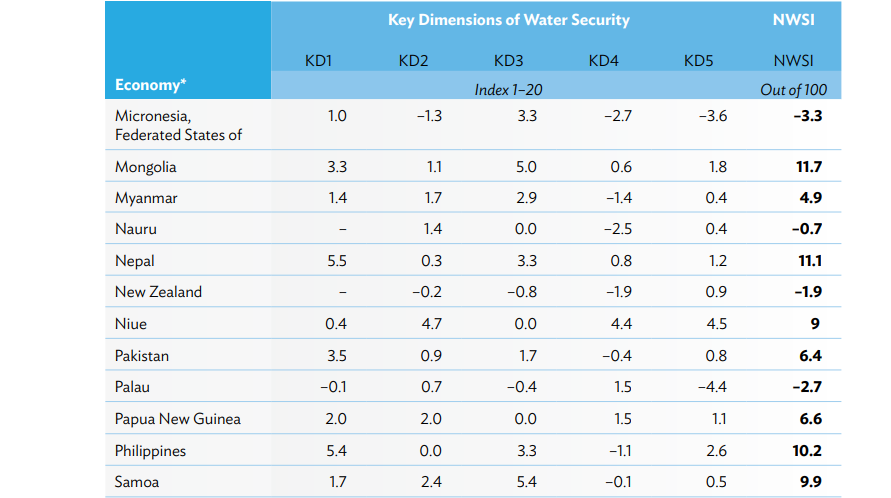 एडीबीले ग्रामीण भेगमा जल सुरक्षासँगै जलको अर्थतन्त्रमा उपभोग (सिँचाय, ऊर्जा र औद्योगिक प्रयोग), सहरी भेगमा सुरक्षित खानेपानी सेवा उपलब्धता, जल सुरक्षा तथा पर्यावरण संरक्षण र जलसँग सम्बन्धित विपद् सुरक्षामा छुट्टाछुट्टै सूचक बनाएर देशहरूको प्रदर्शन अध्ययन गरेको छ ।