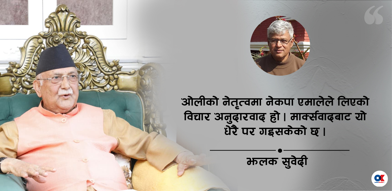 मलाई लाग्छ कमरेड ओलीको नेतृत्वमा नेकपा एमालेले लिएको विचार अनुदारवाद हो । मार्क्सवादबाट यो धेरै पर गइसकेको छ । जबजलाई यसको सारबाट अलग्याइएको छ । मदन भण्डारी समेत अब निकै परबाट चियाउन विवश छन् । एमालेको वैचारिक धार पुरातनवादी दक्षिणपन्थ अर्थात् कन्जर्भेटिजमतिर ढल्केको छ ।