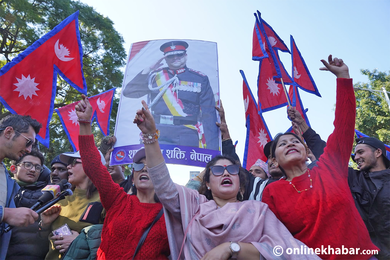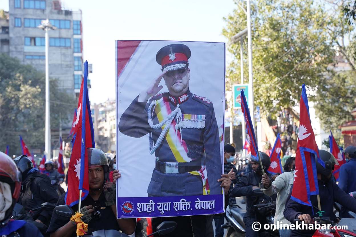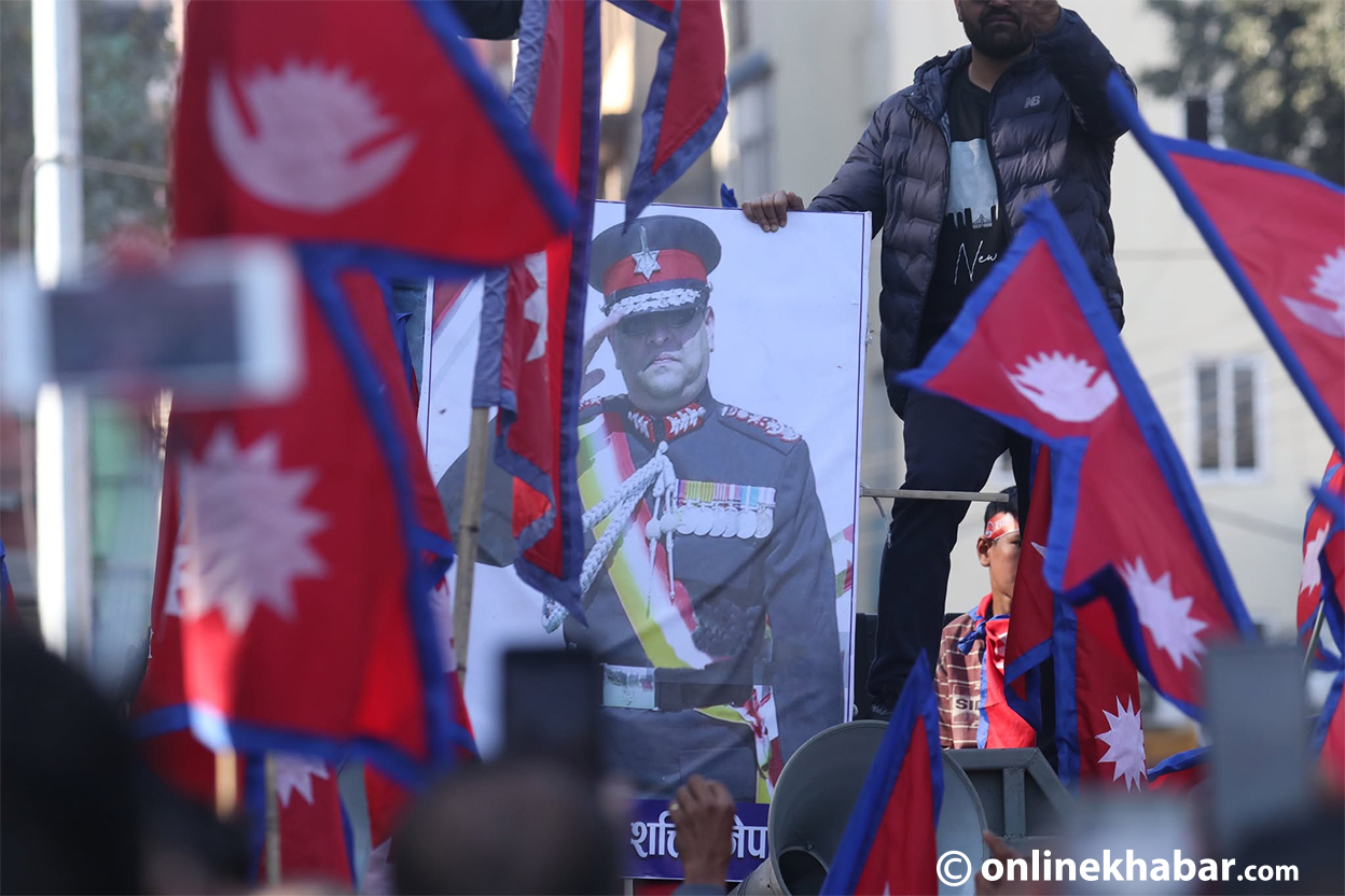 • प्रदर्शनमा राष्ट्रिय झण्डा र पूर्वराजा ज्ञानेन्द्र शाह तथा कोमलको फोटो अंकित प्लेकार्ड बोकेको देखिएको छ।