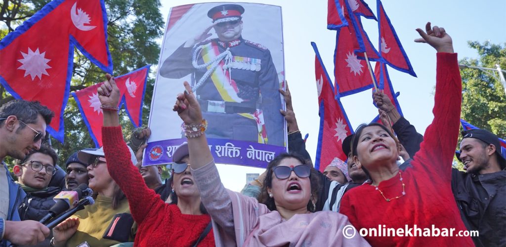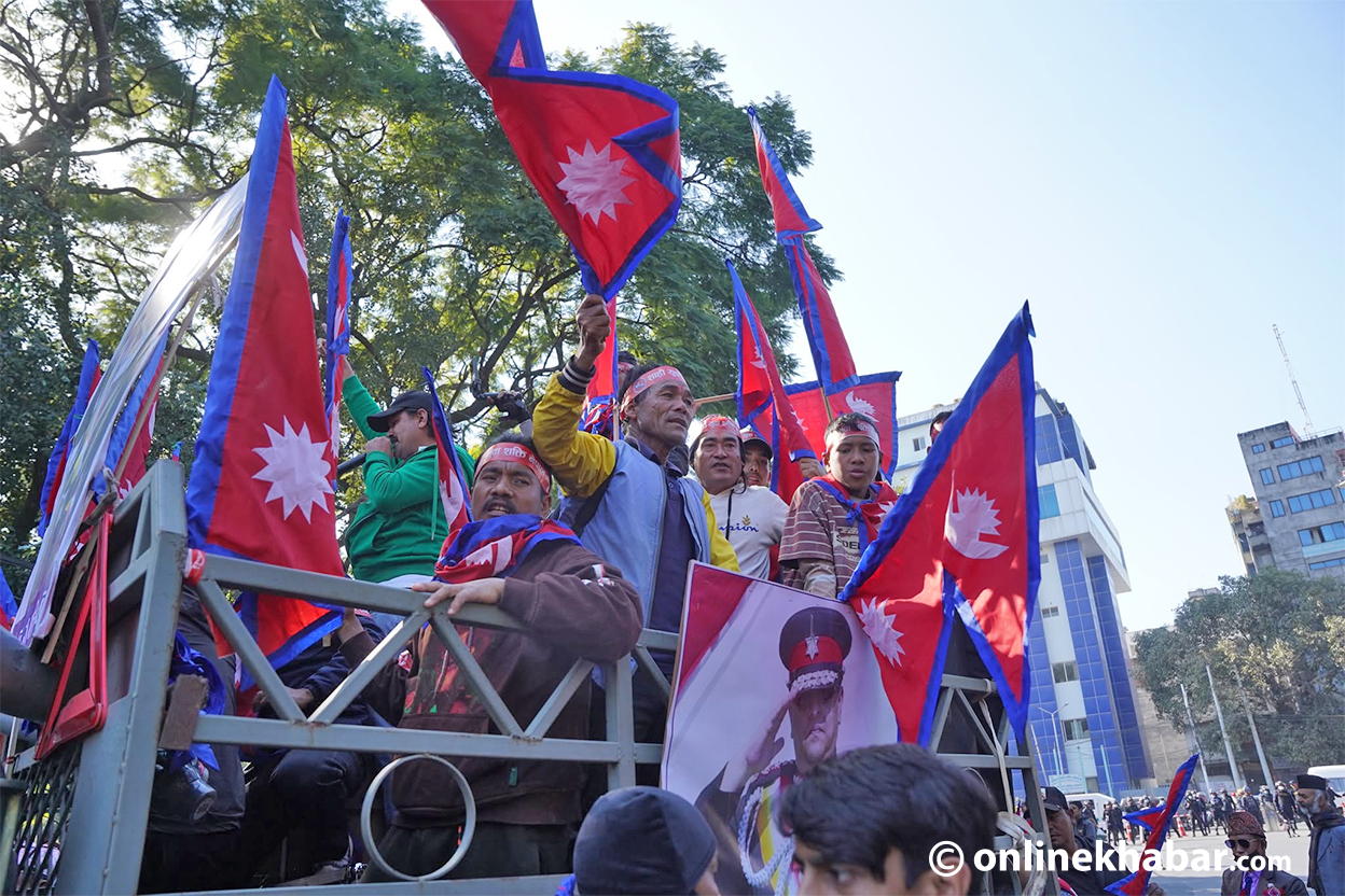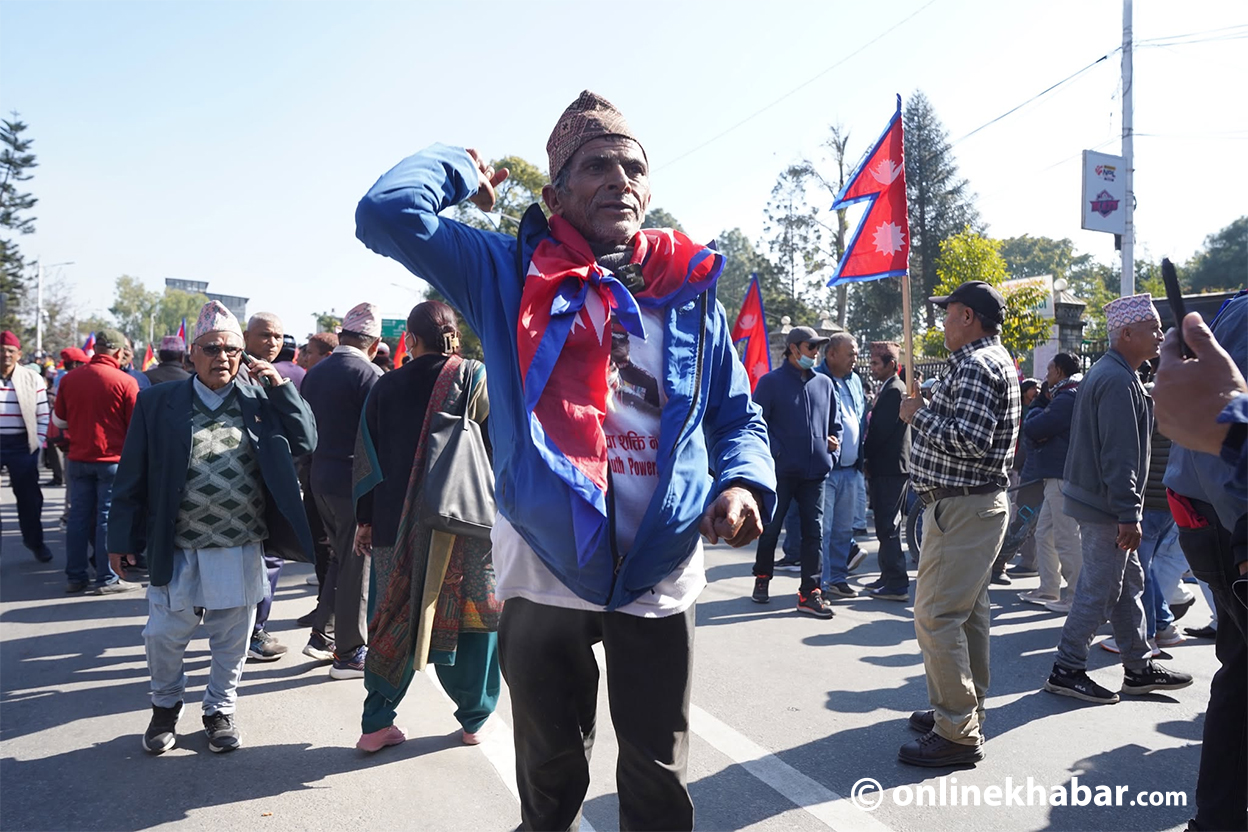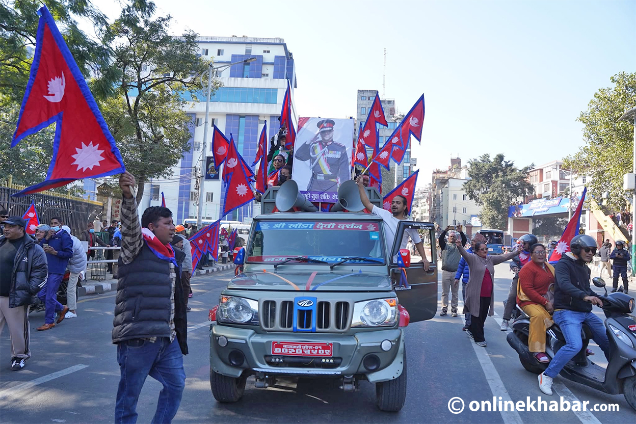 • प्रदर्शनमा राष्ट्रिय झण्डा र पूर्वराजा ज्ञानेन्द्र शाह तथा कोमलको फोटो अंकित प्लेकार्ड बोकेको देखिएको छ।