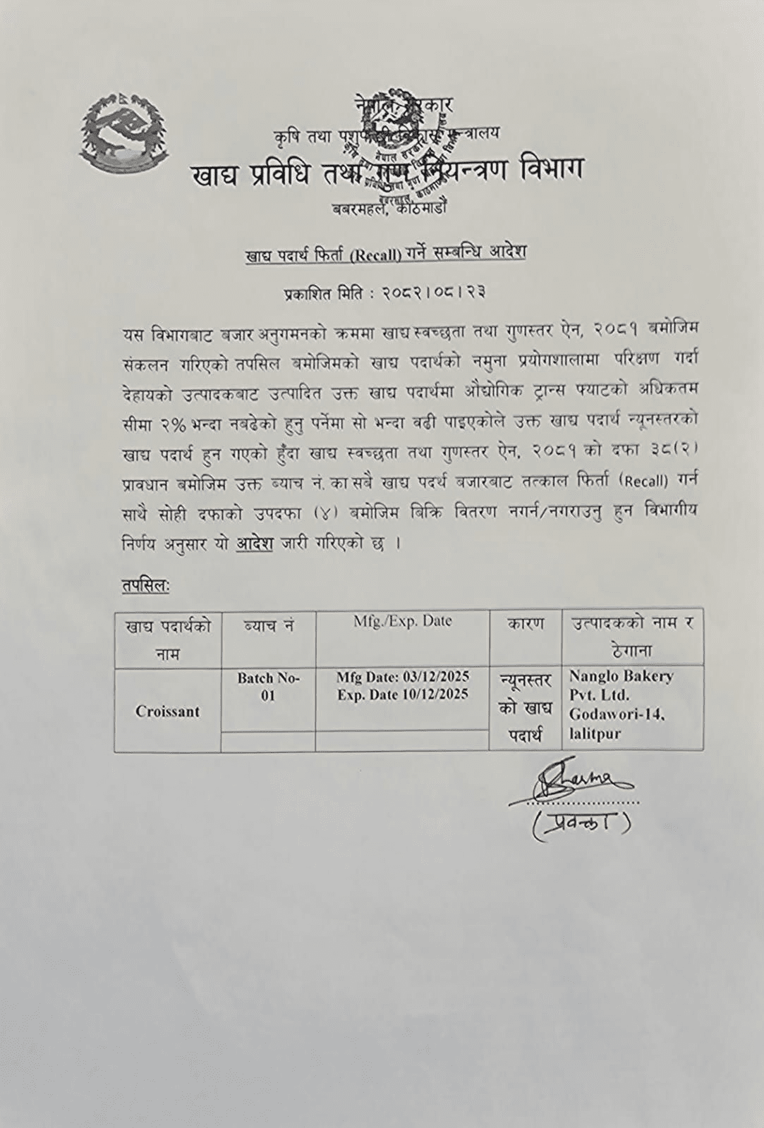 - फिर्ता गर्न भनिएको क्रोइसेन्टको ब्याच नम्बर ०१ हो, उत्पादन मिति ३ मंसिर २०८२ र म्याद समाप्ति मिति २५ पुस २०८२ तोकिएको छ।