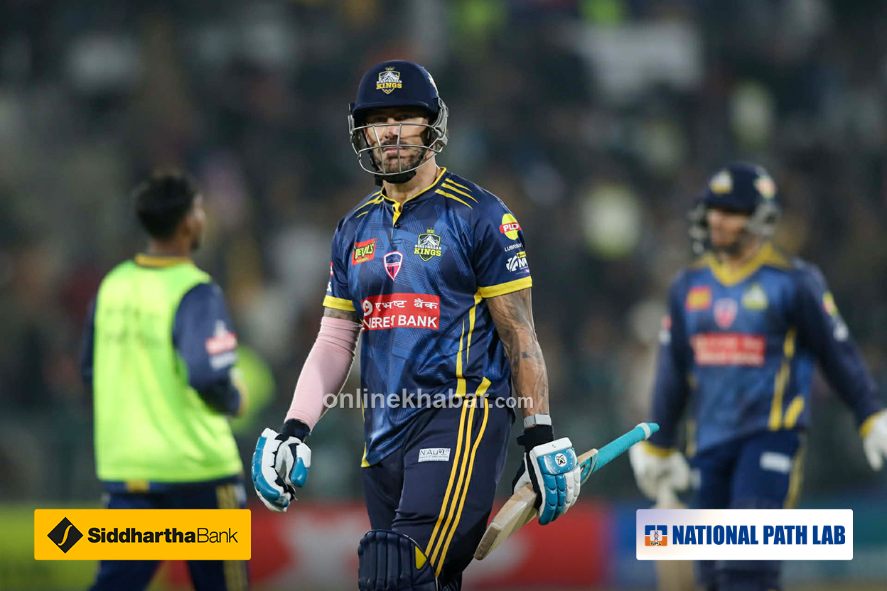 कम स्कोर बनाउने सूचीमा अब विराटनगर किंग्स पनि थपिएको छ । त्यसमा दक्षिण अफ्रिकी स्टार ब्याटर फाफ डु प्लेसी एक्लै करिब आधा रन (३६) योगदान गरेका थिए । अर्को छेउबाट विकेट गइरहेपनि ओपनिङ गर्दै ११औं ओभरसम्म क्रिजमा टिकका डु प्लेसीले २९ बल खेल्दा ३ चौका र१ छक्का प्रहार गरे । दक्षिण अफ्रिकाकै बलर मर्चेन्ट डे लाङले आठौं नम्बरमा आएर ११ बलमा १ चौका र १ छक्का प्रहार गर्दै १५ रन जोडे । बसिर अहमदले १८ बलमा २ चौका मदतमा १२ रन बनाए । बाँकी खेलाडीले दोहोरो अंक समेत छुन सकेनन् । त्यसमा पनि दुई खेलाडी खाता नखोली आउट भए ।