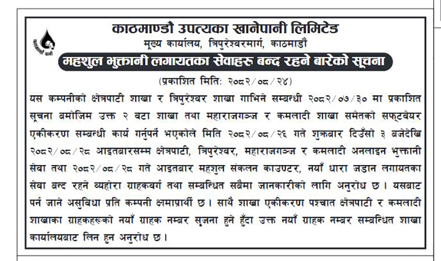 क्षेत्रपाटी, त्रिपुरेश्वर, महाराजगञ्ज र कमलादीमा अनलाइन भुक्तानी सेवा बन्द हुने र २८ गते आइतबार महशुल संकलन काउन्टर र नयाँ धारा जडान लगायतका सेवा पनि बन्द रहने सूचनामा उल्लेख छ ।