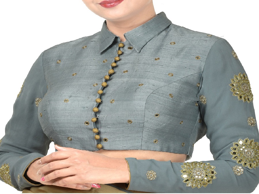 शर्ट कलर फुल स्लीभ ब्लाउज फ्युजन लुक दिन्छ । शर्टको कलर र कफ भएको भेल्भेट वा ब्रोकेड ब्लाउज जसमा अगाडि बटन लाइन हुन्छ । यो स्टाइल युवतीहरूलाई धेरै मन पर्छ ।