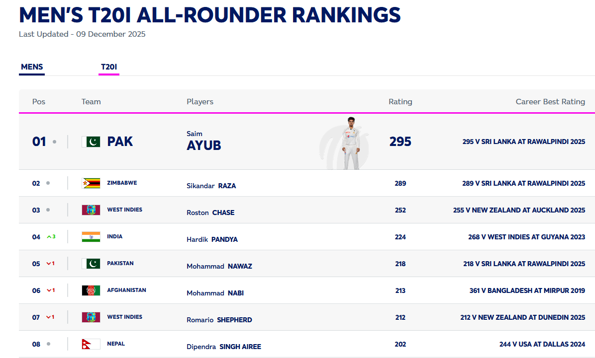 अलराउण्डर वरियताको शीर्ष स्थानमा पाकिस्तानका सायम अयुब कायमै छन् । दोस्रोमा सिकन्दर राजा, तेस्रोमा वेस्ट इन्डिजका रस्टन चेज यथावत् छन् ।