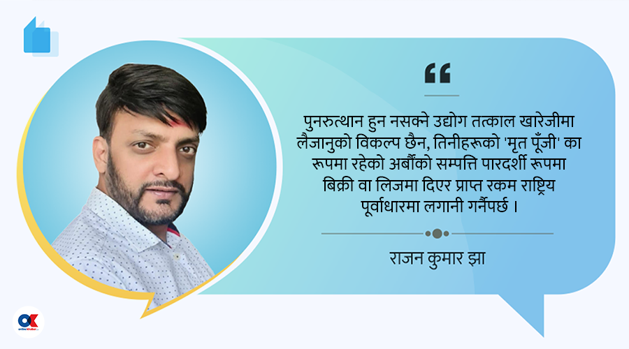 वर्षौंदेखि रुग्ण उद्योगको पुनर्जीवनका लागि भावनात्मक होइन, व्यावहारिक समाधान खोज्नुपर्छ । यसका लागि सार्वजनिक(निजी साझेदारी नै सबैभन्दा बुद्धिमानी र प्रभावकारी बाटो हो । सरकारले अब मालिकको भूमिका त्यागेर नियामकको भूमिका निर्वाह गर्नुपर्छ । अनुभवले देखाउँछ कि सरकारले व्यवसाय चलाउँदा नाफा नोक्सानभन्दा राजनीतिक स्वार्थ हावी हुने सम्भावना बढी हुन्छ ।