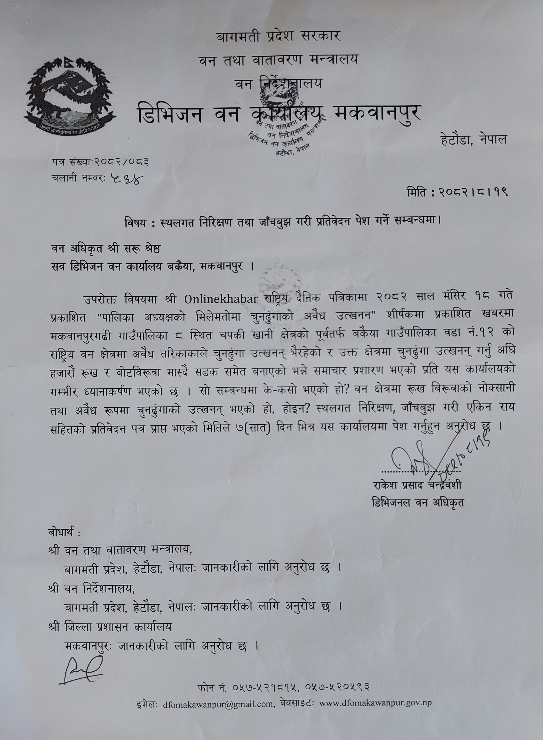 अनलाइनखबरमा ‘पालिका अध्यक्षको मिलेमतोमा चुनढुंगाको अवैध उत्खनन’ शीर्षकमा समाचार प्रकाशित भएपछि खानी विभागले अध्ययन तथा अनुसन्धान टोली खटाएको छ । जिल्ला प्रशासन कार्यालय मकवानपुर र डिभिजन वन कार्यालय मकवानपुरले अवैध उत्खनन तथा बिक्रीमा रोक लगाएको हो ।