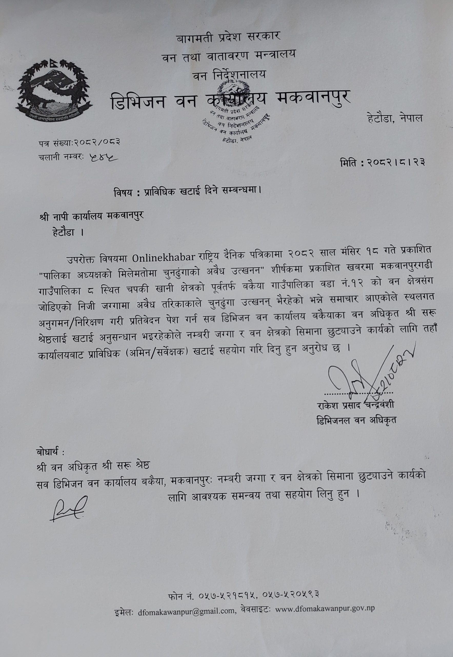 डिभिजन वनले नापी कार्यालय मकवानपुरलाई उत्खनन क्षेत्रलाई नम्बर जग्गा र वन क्षेत्रको सीमाना छुट्याउने कार्यको लागि प्राविधिक टोली खटाउन पत्राचारसमेत गरेको छ । वन क्षेत्रबाट उत्खनन भइरहेको पाइए दोषिलाई वन मुद्दामा कारबाही गरिने डिभिजन वन प्रमुख राकेशप्रसाद चन्द्रवंशीले अनलाइनखबरलाई बताए ।