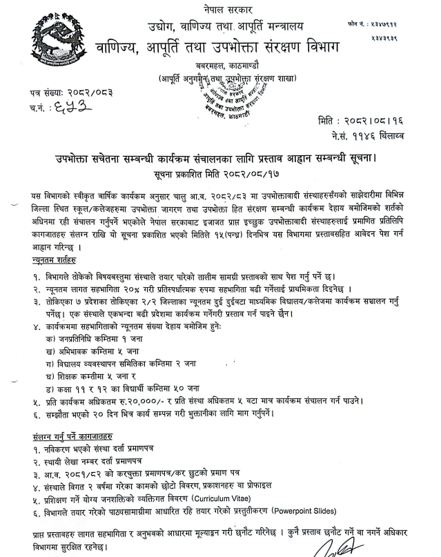Generated by OK AI. Editorially reviewed.- वाणिज्य, आपूर्ति तथा उपभोक्ता संरक्षण विभागले उपभोक्ता सचेतना कार्यक्रम सञ्चालन गर्न इच्छुक संस्थाबाट १५ दिनभित्र प्रस्ताव आह्वान गरेको छ।