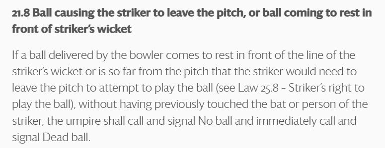 यदि बल ब्याटर भएको ठाउँमा नआइपुग्दै पिचमै रोकिएको अवस्थामा अथवा बल पिचभन्दा बाहिर गएर ब्याटरले पिच छाडेर खेल्नुपर्ने अवस्था भएमा अम्पायरले नो बल दिने र लगत्तै डेडबल पनि दिने उल्लेख छ ।