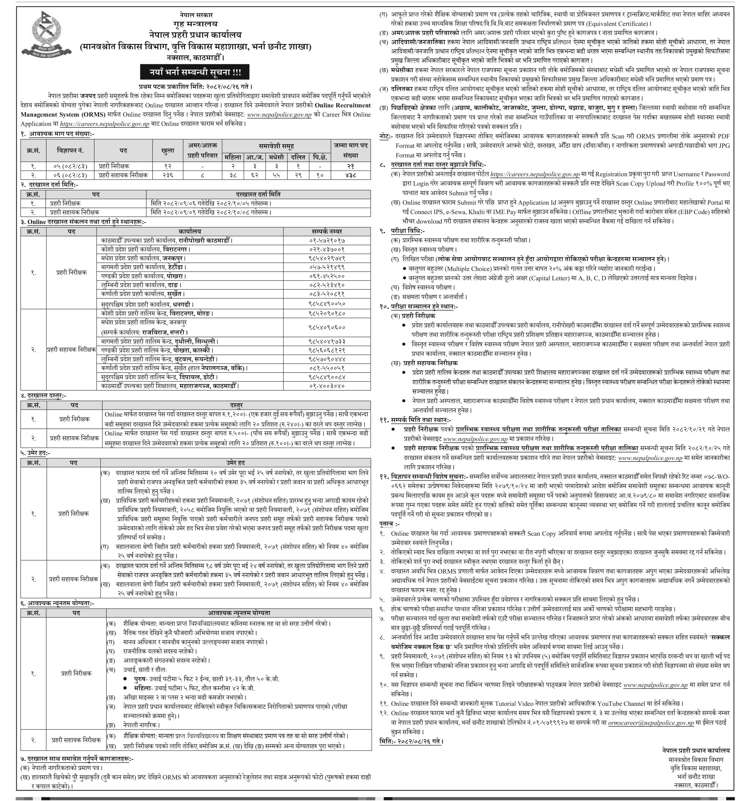 • नेपाल प्रहरीले जनपद प्रहरी समूहतर्फ २१ निरीक्षक र ४३८ सहायक निरीक्षक पदमा भर्ना खुलाएको छ।