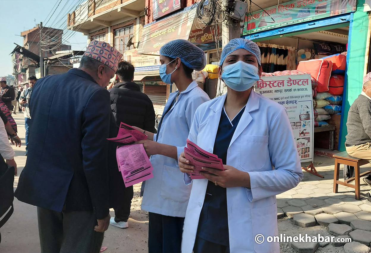 ब्लड प्रेसर नाप्नेदेखि दन्त स्वास्थ्य परीक्षण गराइरहेका छन । एमाले महाधिवेशनमा आएकाहरू सोधपुछको लागि पर्चा बाँडिरहेको ठाउँमा रोकिन्छन् । अनि २५ वर्षीया डेन्टल हाइजिनिस्ट सृजना लाखे र उनकी साथीले पर्चा थमाइदिहाल्छिन् ।