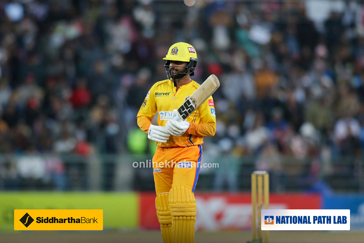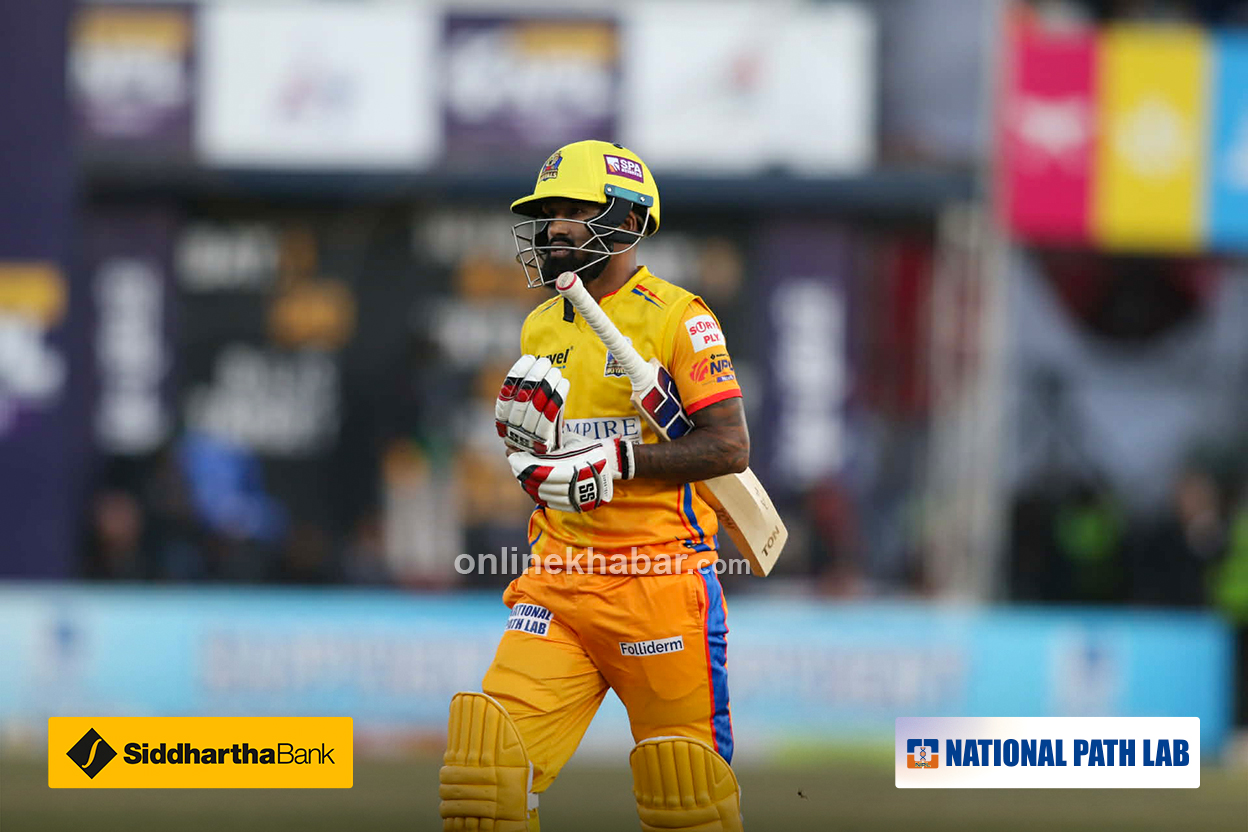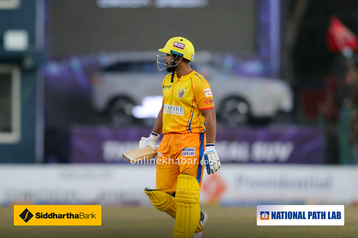 ब्याटरले गलत शटहरू खेलेर विकेट गुमाइरहेका थिए । टोलीका लागि सर्वाधिक रन बनाएर विनोद भण्डारी आज खाता नै नखोली आउट भए । उनले स्वीप शट खेल्ने क्रममा स्कूप पनि मिसाउन खोज्दा बल क्याचका लागि गएको थियो ।