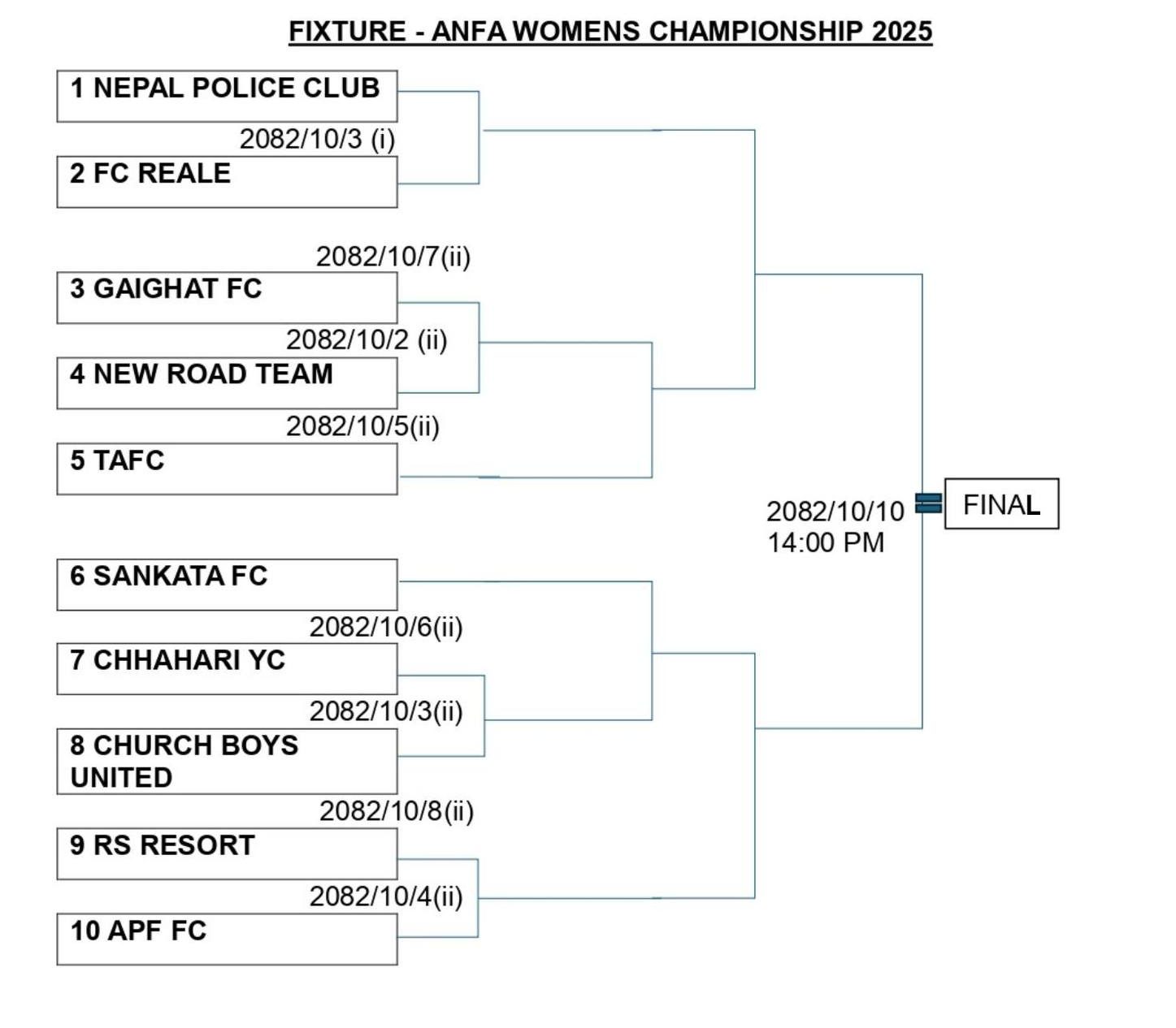 - प्रतियोगिताको फाइनल माघ १० गते हुने एन्फाले जानकारी दिएको छ।