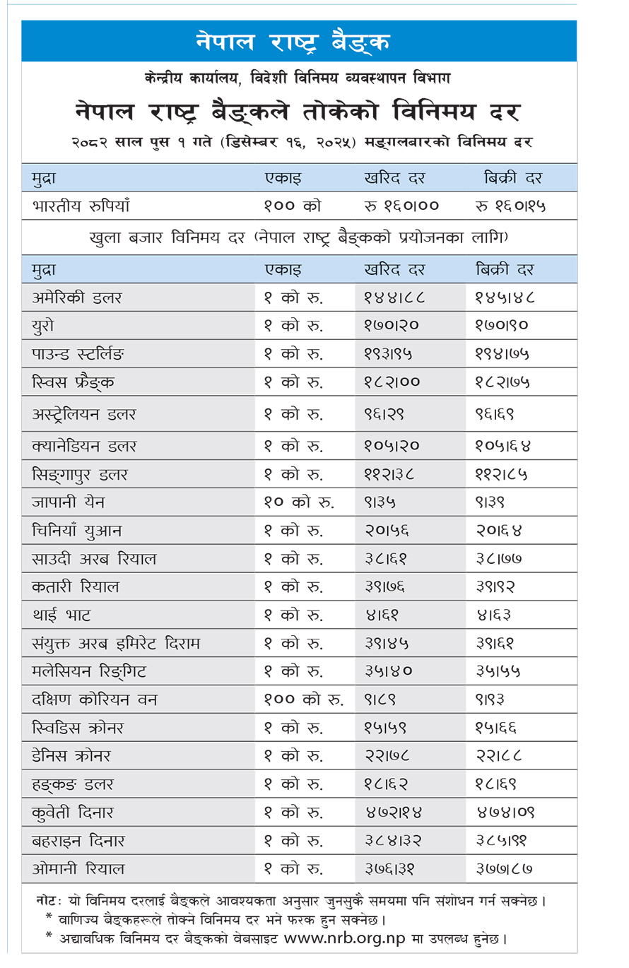 - राष्ट्र बैंकले विनिमयदर आवश्यकतानुसार संशोधन गर्न सक्ने र अद्यावधिक विनिमयदर वेबसाइटमा उपलब्ध हुने जनाएको छ।
