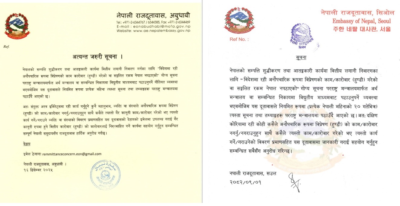 दक्षिण कोरिया, संयुक्त अरब इमिरेट्स (यूएई) लगायतका देशमा रहेका नेपाली दूतावासले सार्वजनिक सूचना जारी गर्दै हुन्डीमार्फत नेपाल पैसा नपठाउन अनुरोध गरेका हुन्।