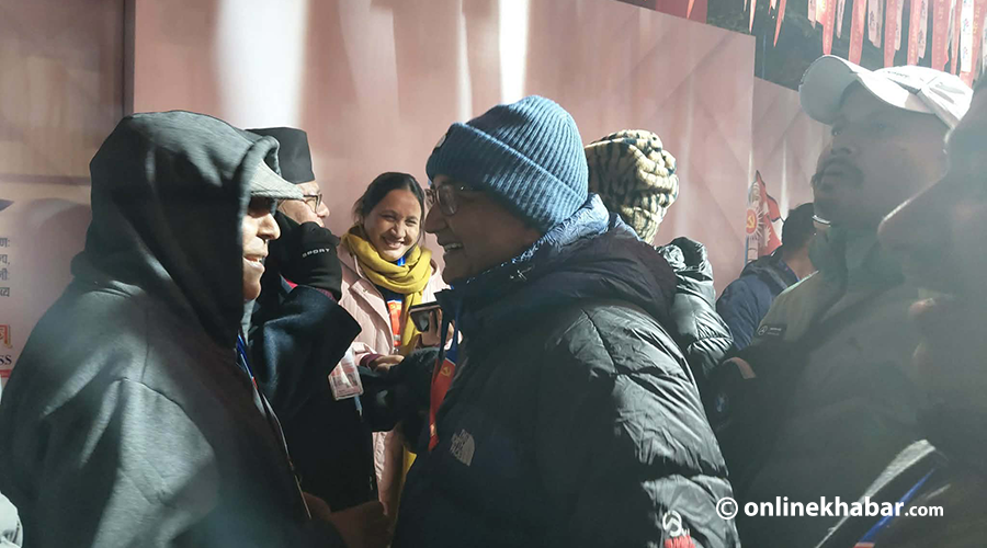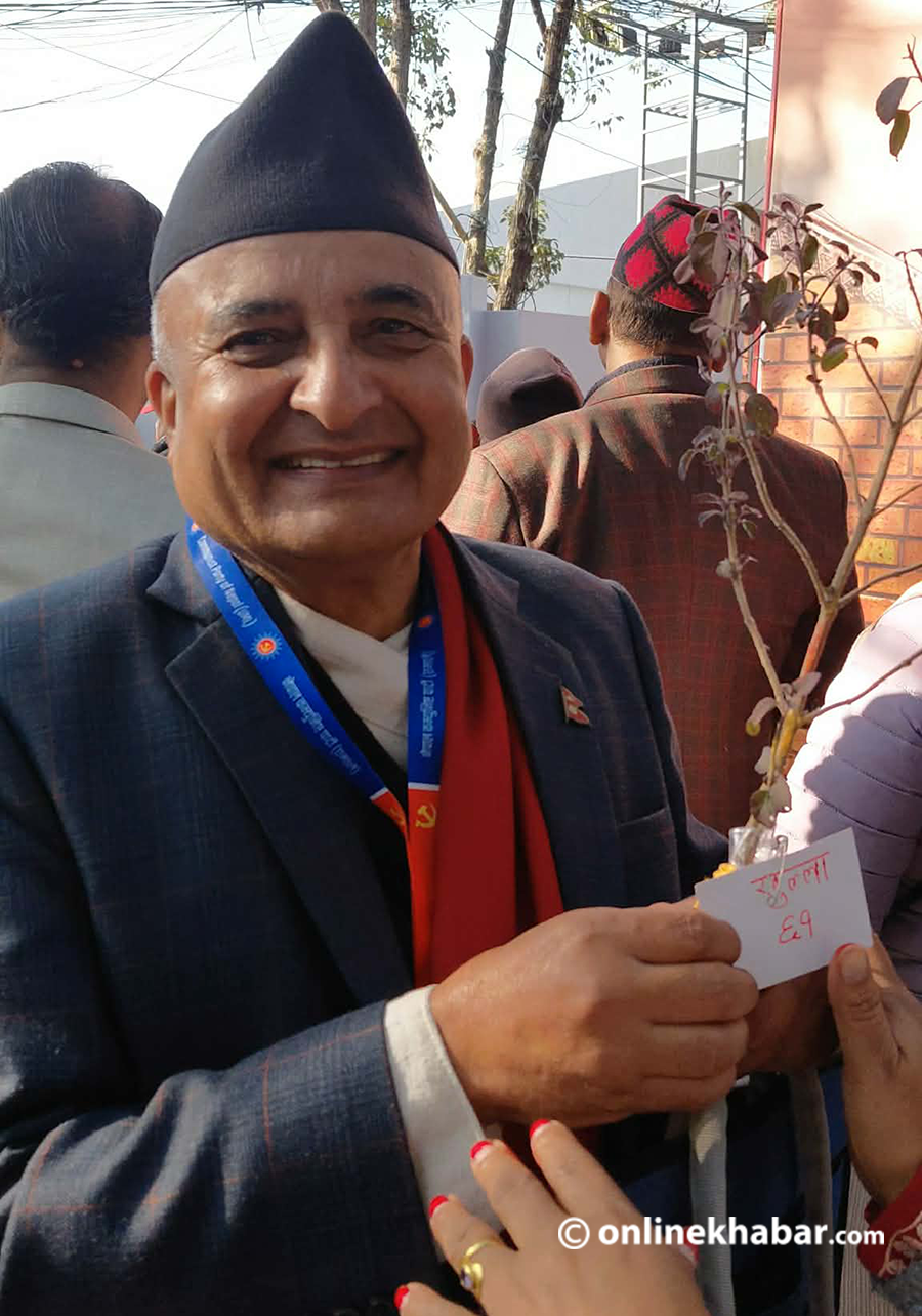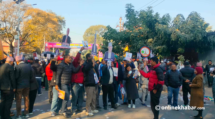 अध्यक्षका उम्मेदवार ईश्वर पोखरेल महाधिवेशन प्रतिनिधिहरूसँग मत मागिरहेका थिए ।
