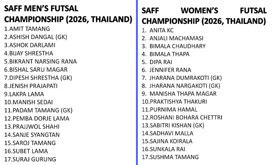 ३ पुस, काठमाडौं । थाइल्यान्डमा हुने साफ फुटसल च्याम्पियनसिप २०२६ का लागि नेपाली पुरुष र महिला टोलीको बन्द प्रशिक्षण घोषणा भएको छ । प्रशिक्षणका लागि दुवैतर्फ समान १७ खेलाडी बोलाइएका छन् ।