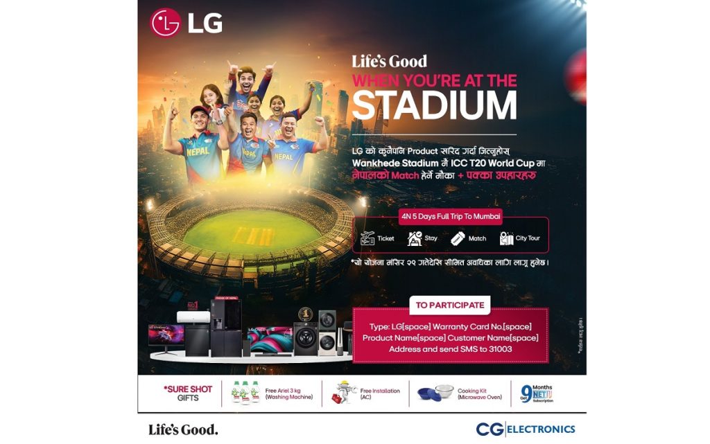 सीमित अवधिका लागि लागु हुने यस अफरअन्तर्गत कुनै पनि एलजी प्रोडक्ट खरिद गर्ने ग्राहकले भारतको मुम्बईस्थित प्रतिष्ठित वानखेडे स्टेडियममा प्रत्यक्ष खेल हेर्न पाउने ४ रात ५ दिनको पूर्ण प्रायोजित यात्रा गर्ने अवसर जित्न सक्नेछन् ।