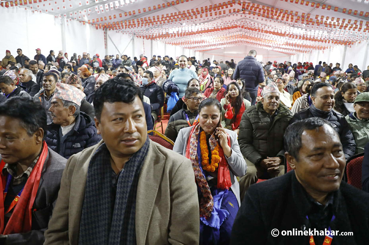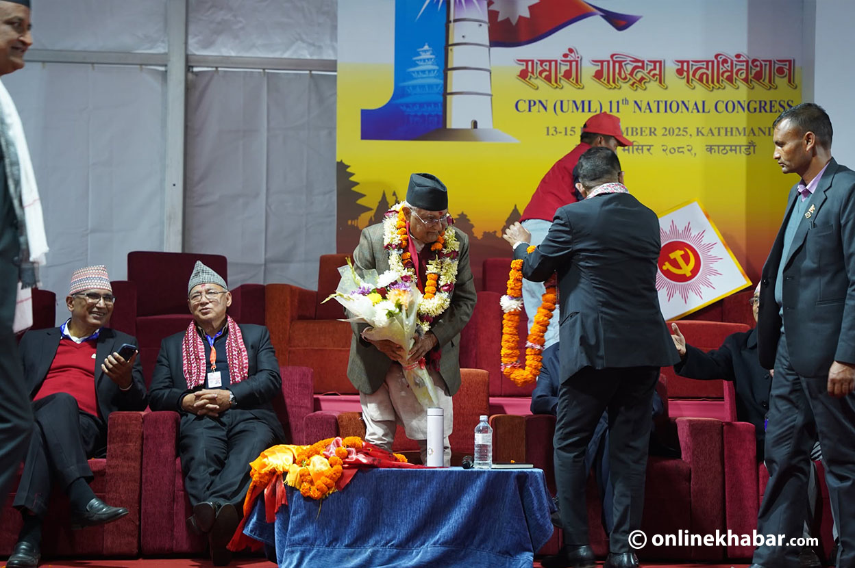 शपथ अघि महाधिवेशन आयोजनास्थल भृकुटीमण्डपमा अहिले ओली सहित निर्वाचित पदाधिकारीलाई नेता, कार्यकर्ताले माला तथा खादा लगाएर बधाई दिइरहेका छन् ।