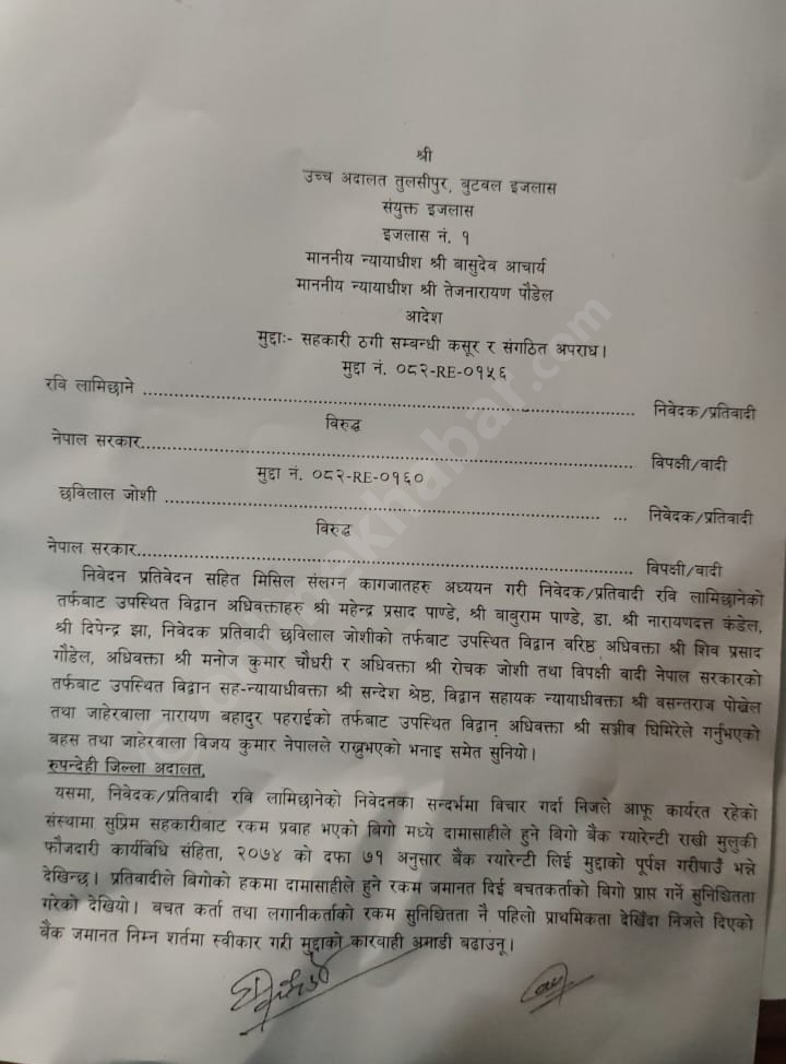 न्यायाधीश बासुदेव आचार्य र तेजनारायण पौडेलको इजलासमा उनीहरूको मुद्दाको सुनुवाइ भएको हो । लामिछानेले बिगो बापतको रकम बुझाएर थुनाबाहिर बस्नु पाउँ भनी निवेदन दिएका थिए ।