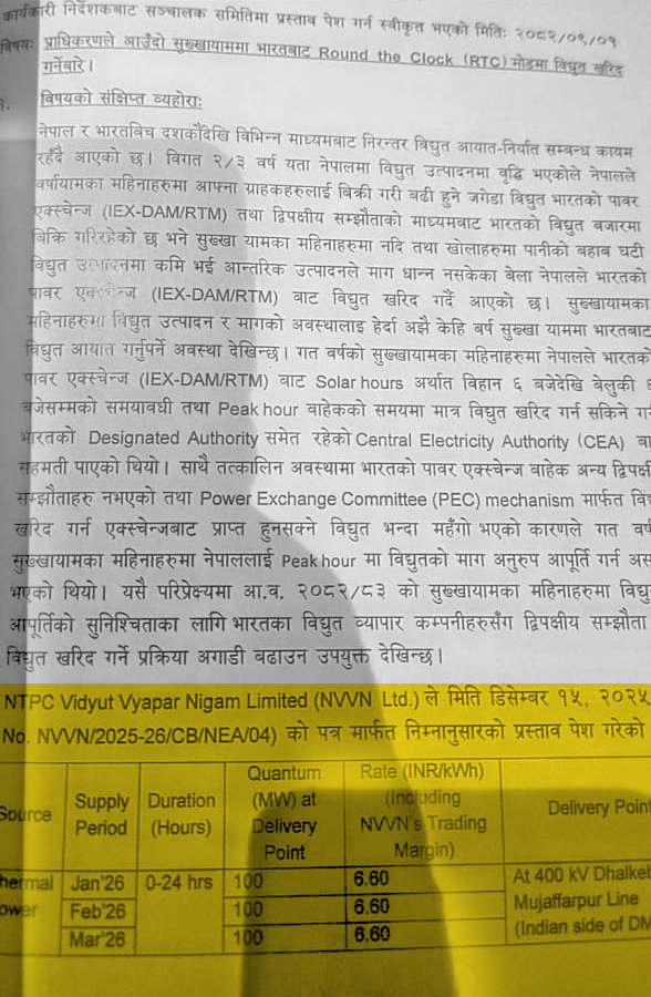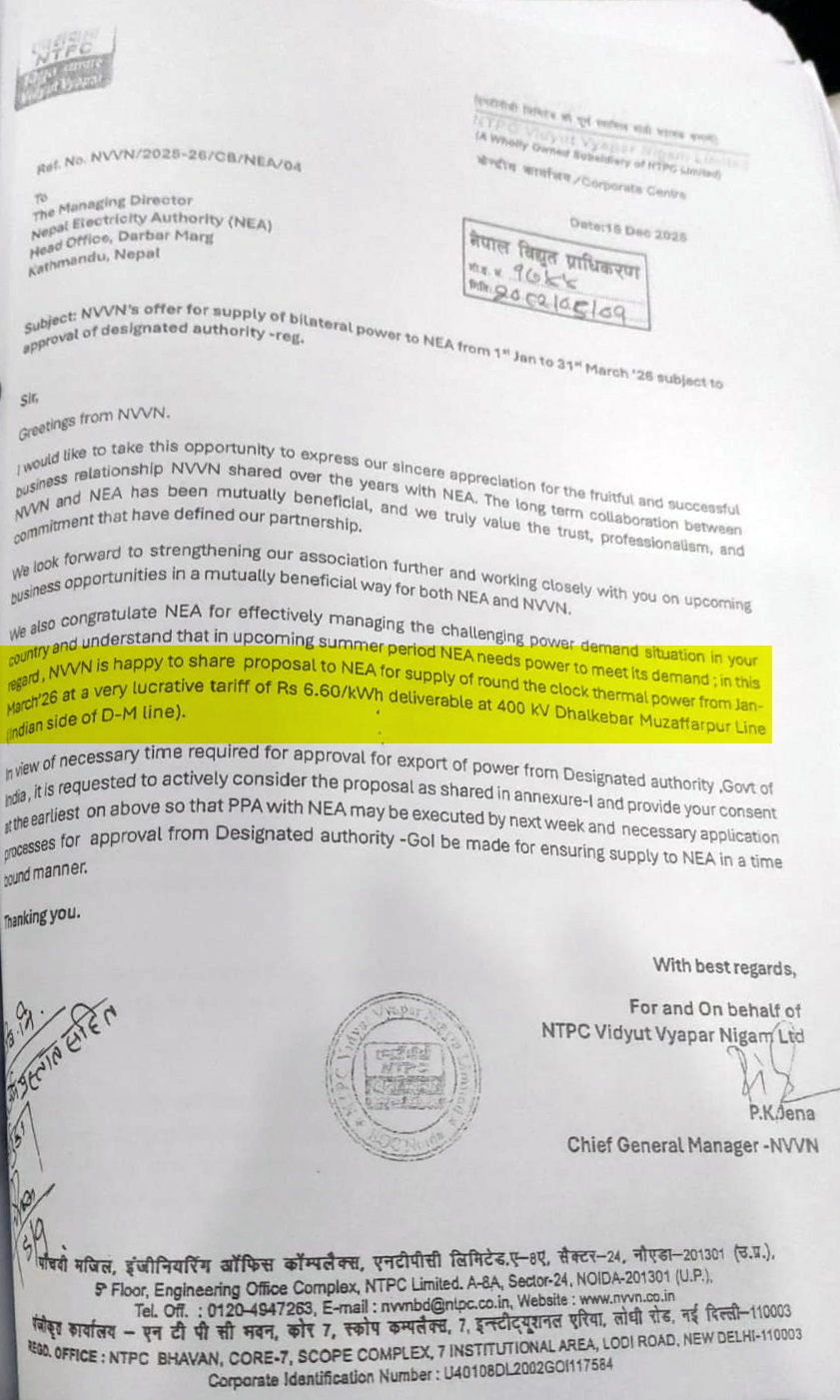 Generated by OK AI. Editorially reviewed.- भारतीय सरकारी कम्पनी एनटीपीसी विद्युत व्यापार लिमिटेडले नेपाल विद्युत् प्राधिकरणलाई प्रतियुनिट ६.६० भारुमा विद्युत् बिक्री प्रस्ताव गरेको छ।