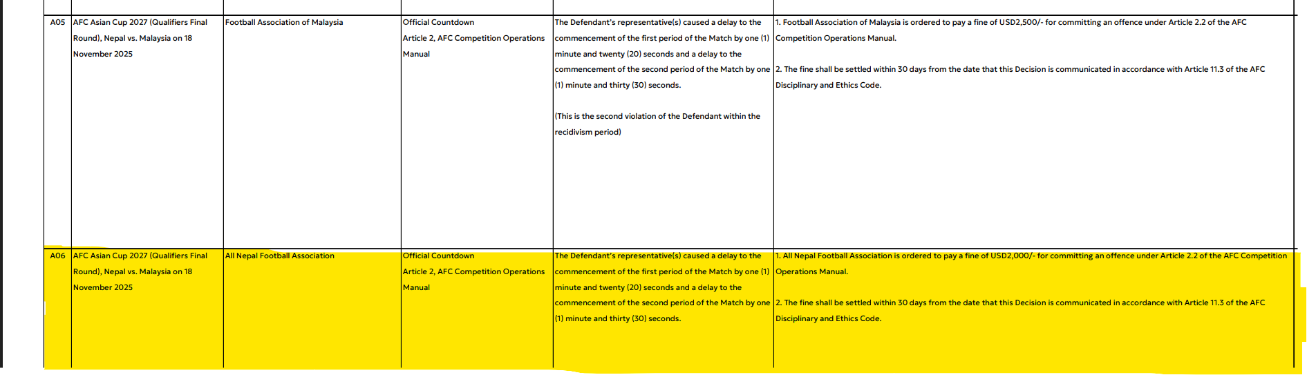 एन्फासँगै मलेसियाको फुटबल संघलाई पनि २ हजार ५०० डलर जरिवाना तोकिएको छ । एएफसीले निर्णय भएको ३० दिनभित्र उक्त जरिवाना भुक्तानी गर्नुपर्ने पनि उल्लेख गरेको छ ।