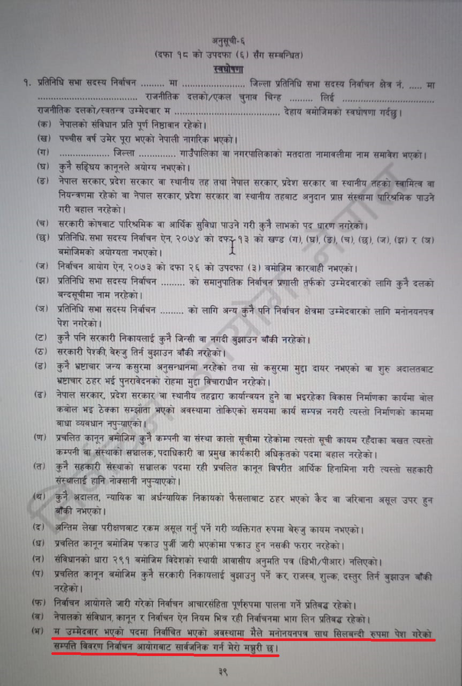 २१ फागुनमा हुने प्रतिनिधिसभा सदस्यको निर्वाचनका लागि आयोगले स्वघोषणाको ढाँचा तयार पारेको छ । जसमा भनिएको छ, ‘म उम्मेदवार भएको पदमा निर्वाचित भएको अवस्थामा मैले मनोनयनपत्र साथ सिलबन्दी रूपमा पेस गरेको सम्पत्ति विवरण निर्वाचन आयोगबाट सार्वजनिक गर्न मेरो मञ्जुरी छ ।’