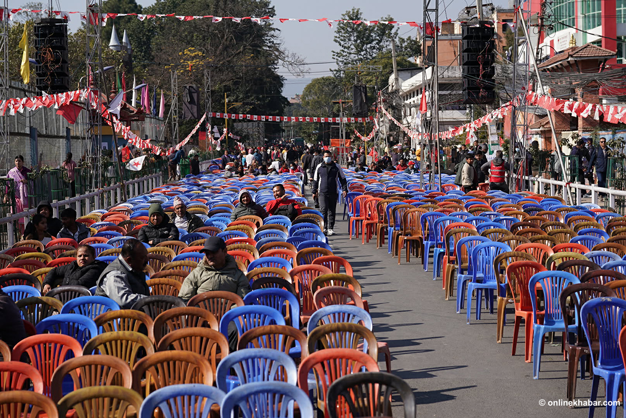 सभाका लागि मञ्च व्यवस्थापनको काम सकिएको छ । अहिले उपत्यका तथा वरपरका जिल्लाबाट नेता-कार्यकर्ताहरू र्यालीसहित प्रदर्शनी मार्ग जान थालेका छन् । मुख्य मञ्ज पद्मोदय मोड नजिक बनाइएको छ ।