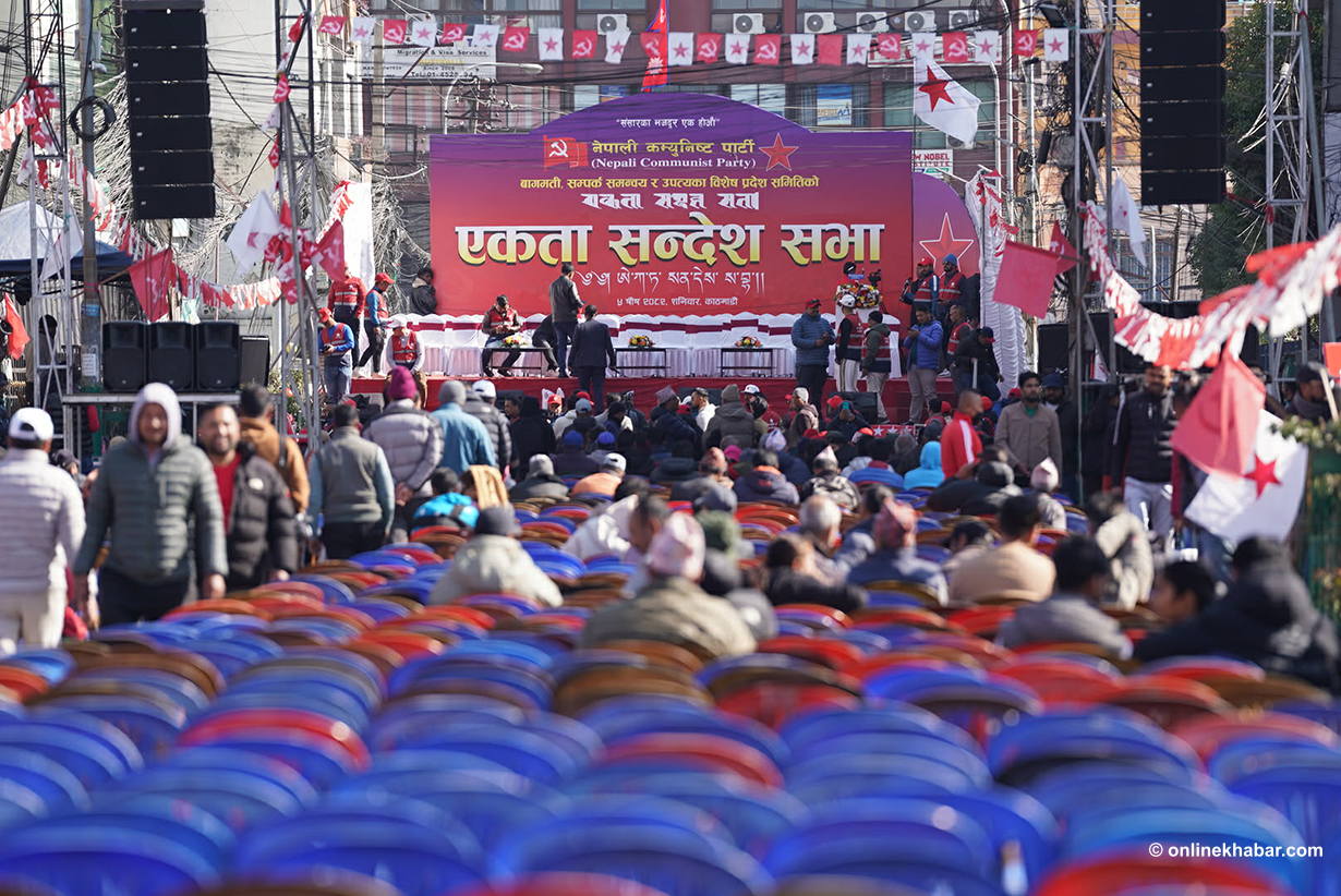 ५ पुस, काठमाडौं । नेपाली कम्युनिस्ट पार्टीले काठमाडौंमा आयोजना गरेको एकता सन्देश सभा सुरु हुँदैछ । भृकुटीमण्डपमा बागमती प्रदेशस्तरीय एकता सन्देश सभा गर्न लागेको हो ।