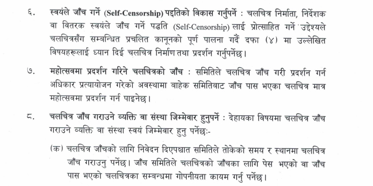 २ पुसदेखि कार्यान्वयनमा आएको ‘चलचित्र जाँच सम्बन्धी कार्यविधि, २०८२’ को सातौं बुँदामा यो कुरा उल्लेख गरिएको छ ।