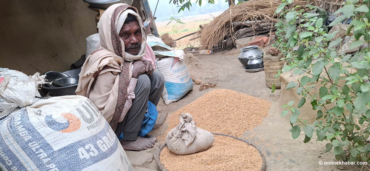 ‘हामी गरिब मान्छे । भरपेट खान त मुस्किल छ । ओढ्ने-ओच्छ्याउने कहाँबाट ल्याउनु ?,’ मंगलबार मध्याह्न आँगनमा बसेर धान छान्दै गरेका उनले दुखेसो पोखे, ‘तल पराल ओछ्याउँछु । माथि पातलो चादर ओढ्छु । यसले जाडो थेग्दैन । धेरै जाडोले निद्रा नलागेपछि घुर ताप्छु । जिउ तताएर फेरि सुत्ने प्रयास गर्छु ।’